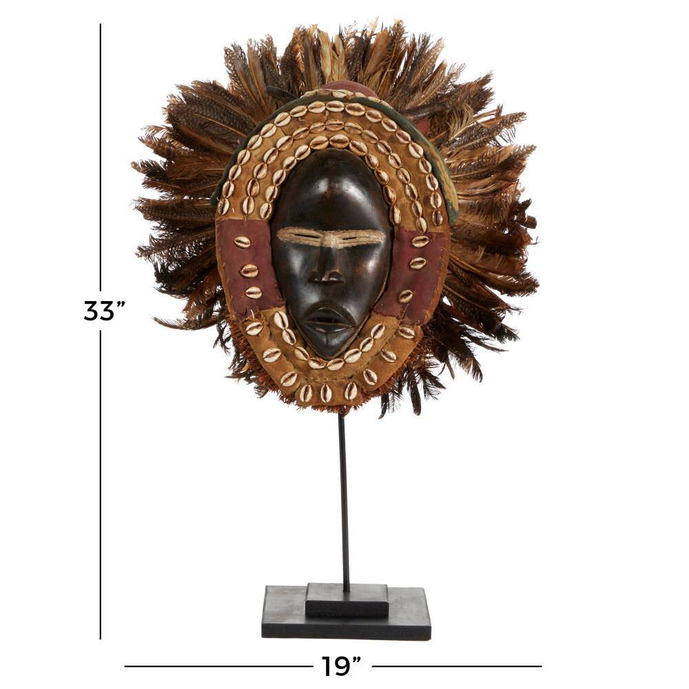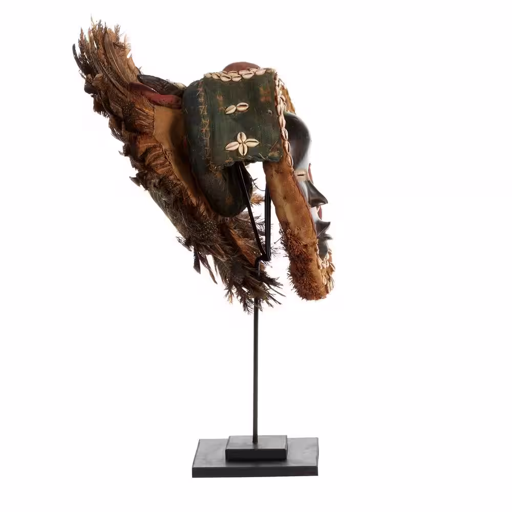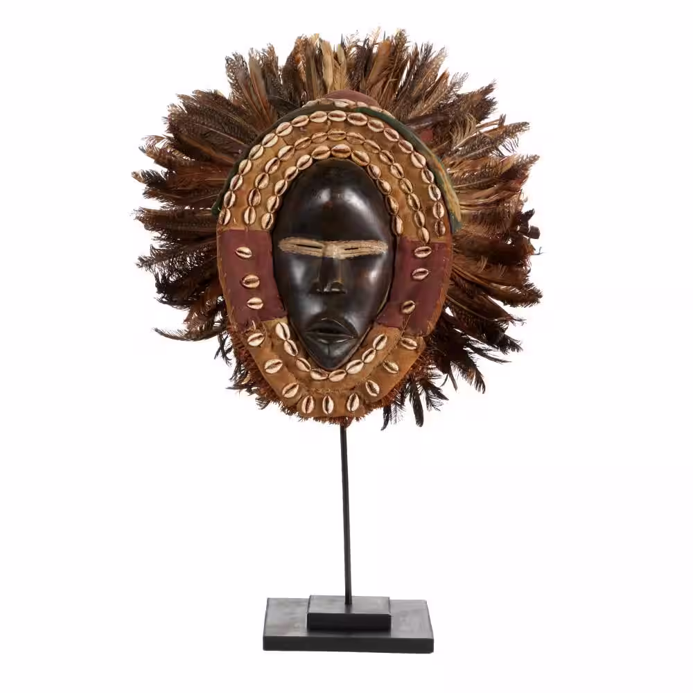 Litton Lane Large Hand-Carved Baobab Wood, Chicken Feathers and Cowrie Shell Dan Mask on Stand