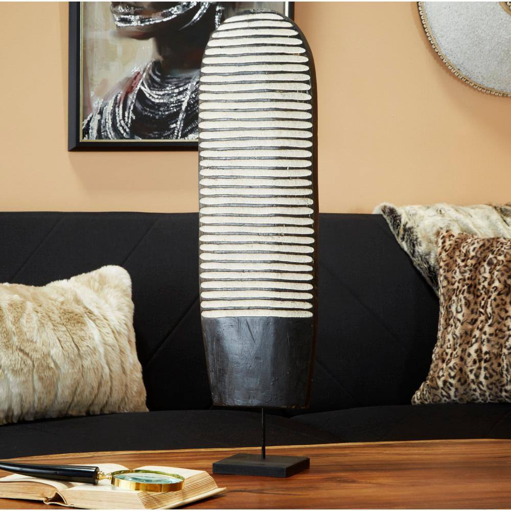 Litton Lane Hand-Carved Black and White Oval Baobab Wood Tikar Shield on Stand