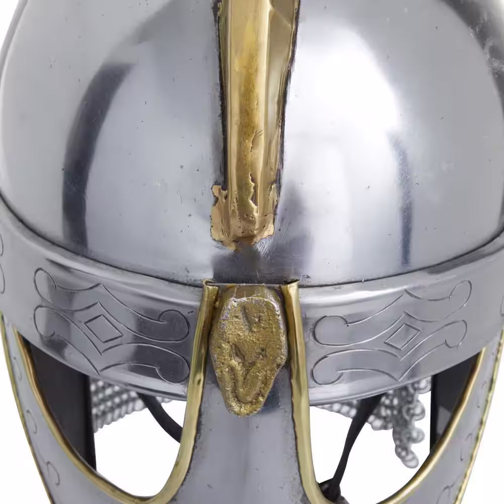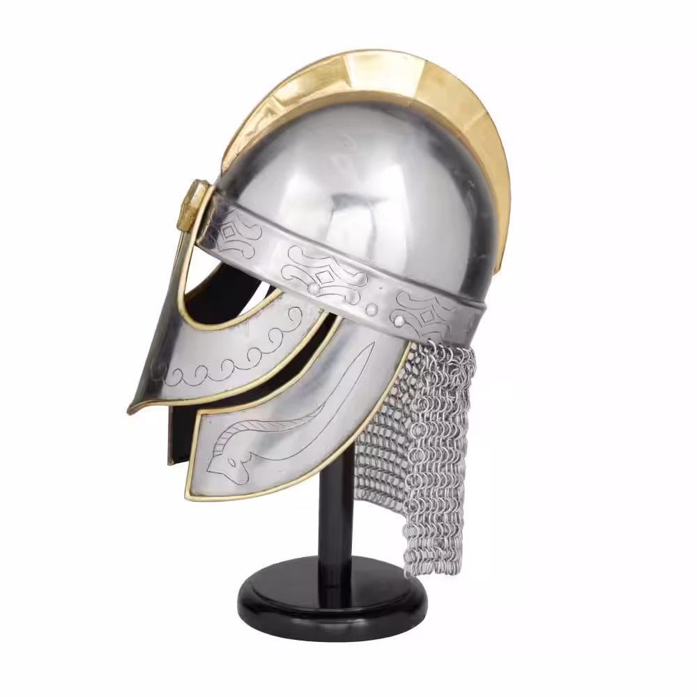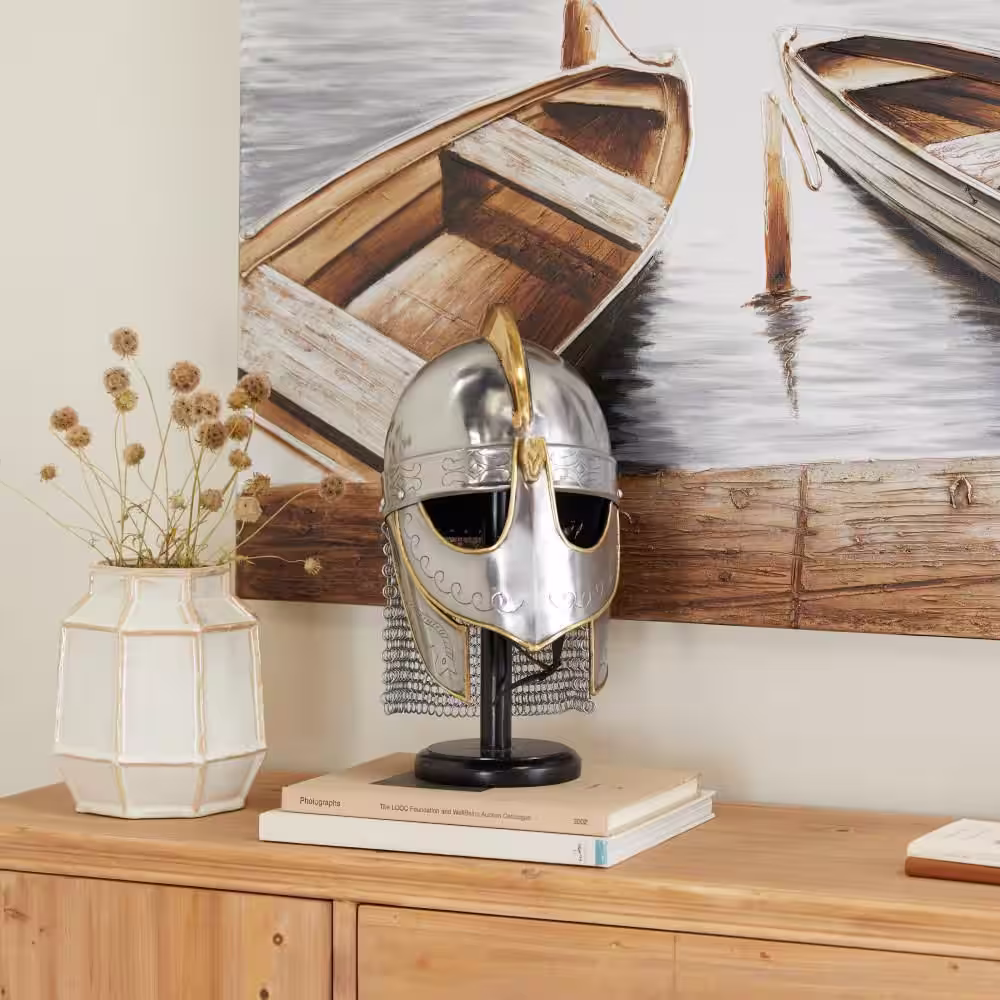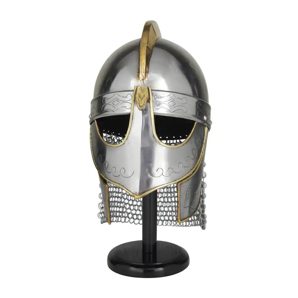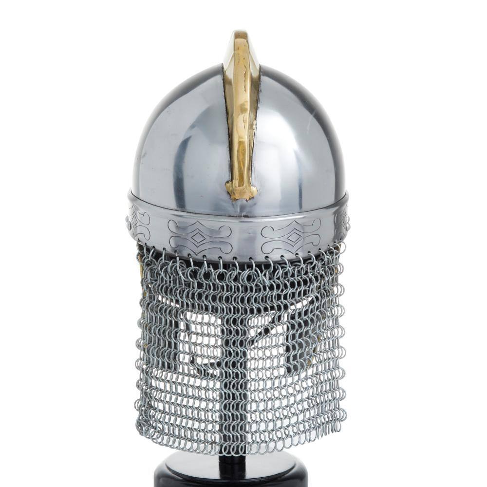 Litton Lane Silver Metal Replica Medieval Knight Crusader Helmet with Black Wood Stand and Chainmail