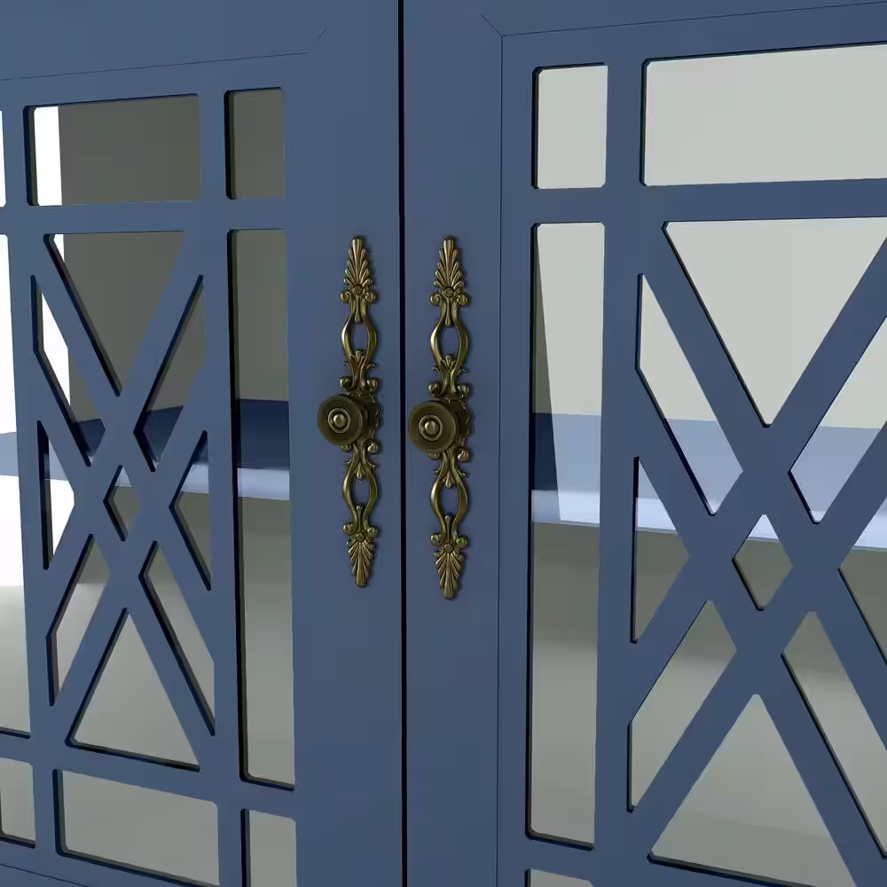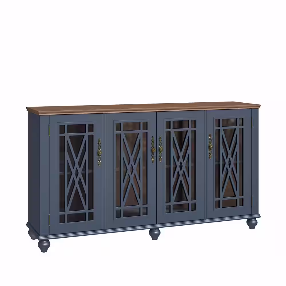 None Vintage Navy MDF 63 in. Storage Buffet Sideboard with Floral Design Doors