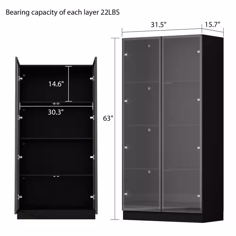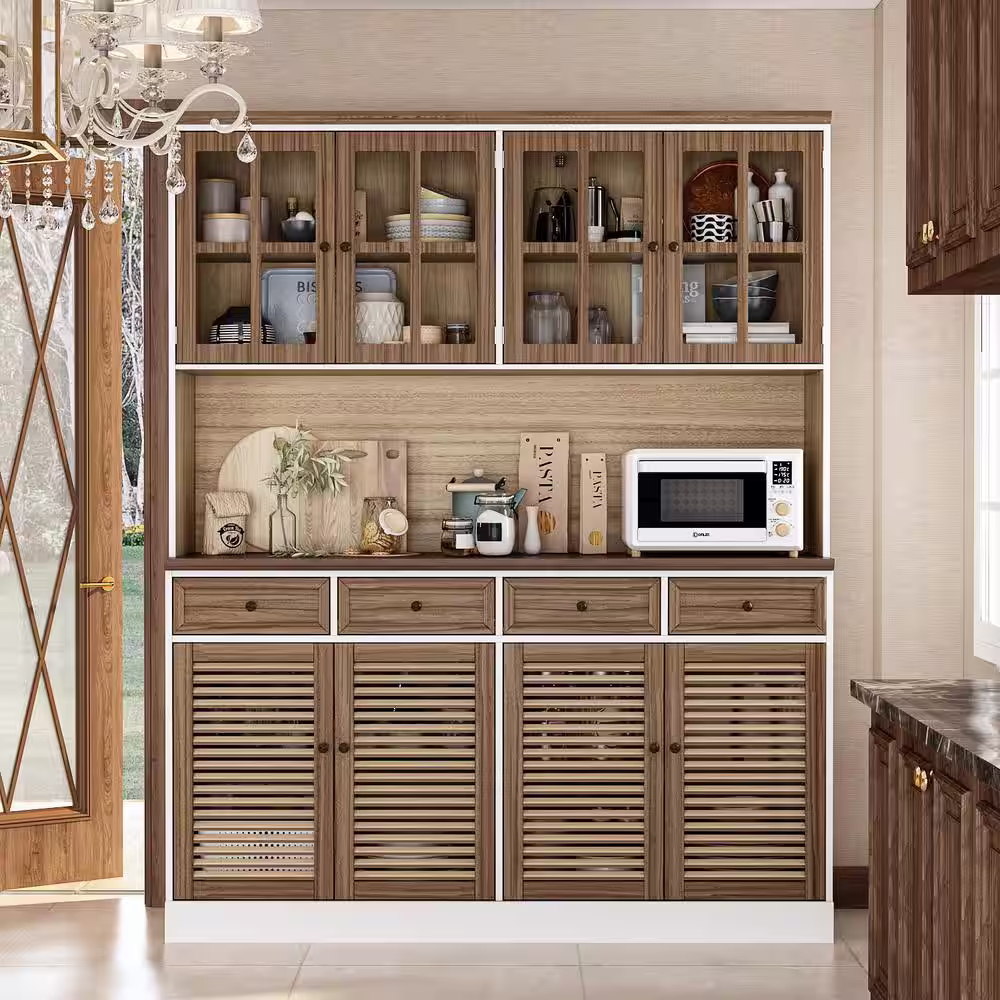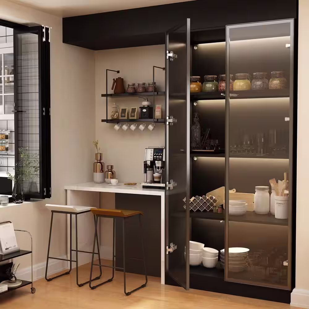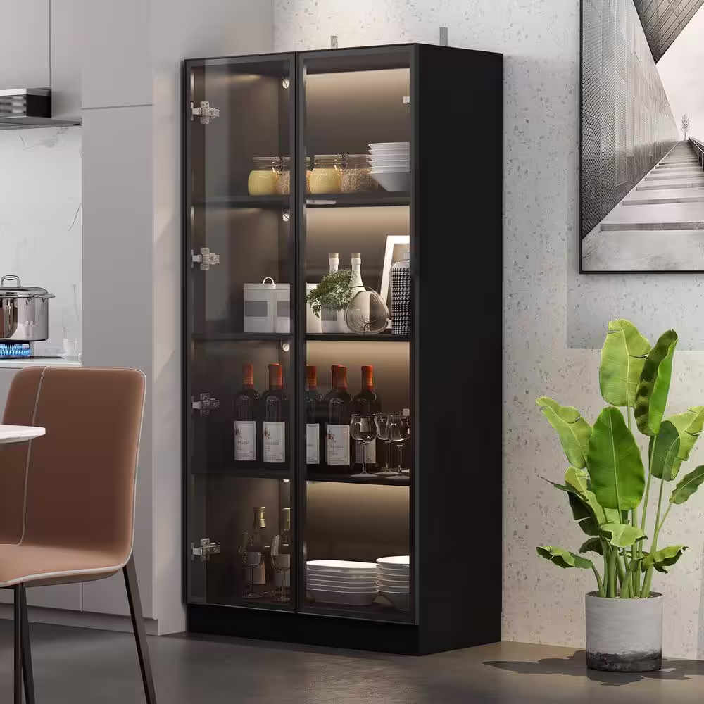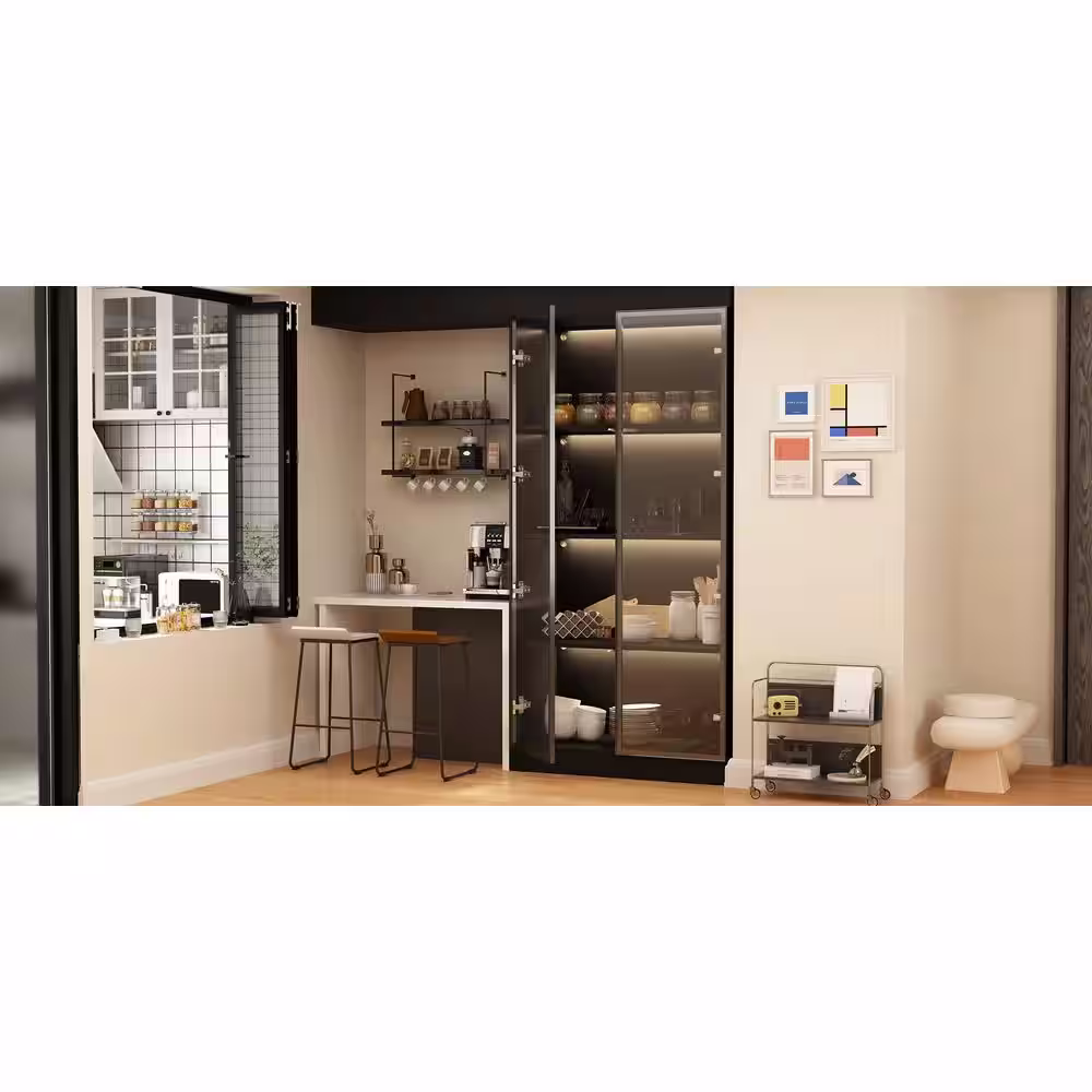None LED Lights Buffet Sideboard Cupboard Food Pantry With Tempered Glass Doors and Aluminum Framed