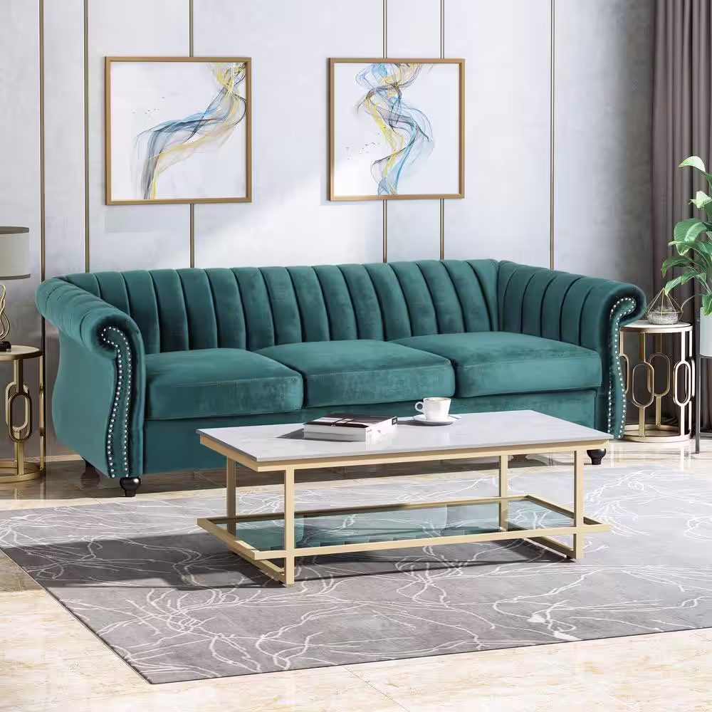 Noble House Bowie 84 in. Teal Solid Velvet 3-Seat Chesterfield Sofa with Nailhead
