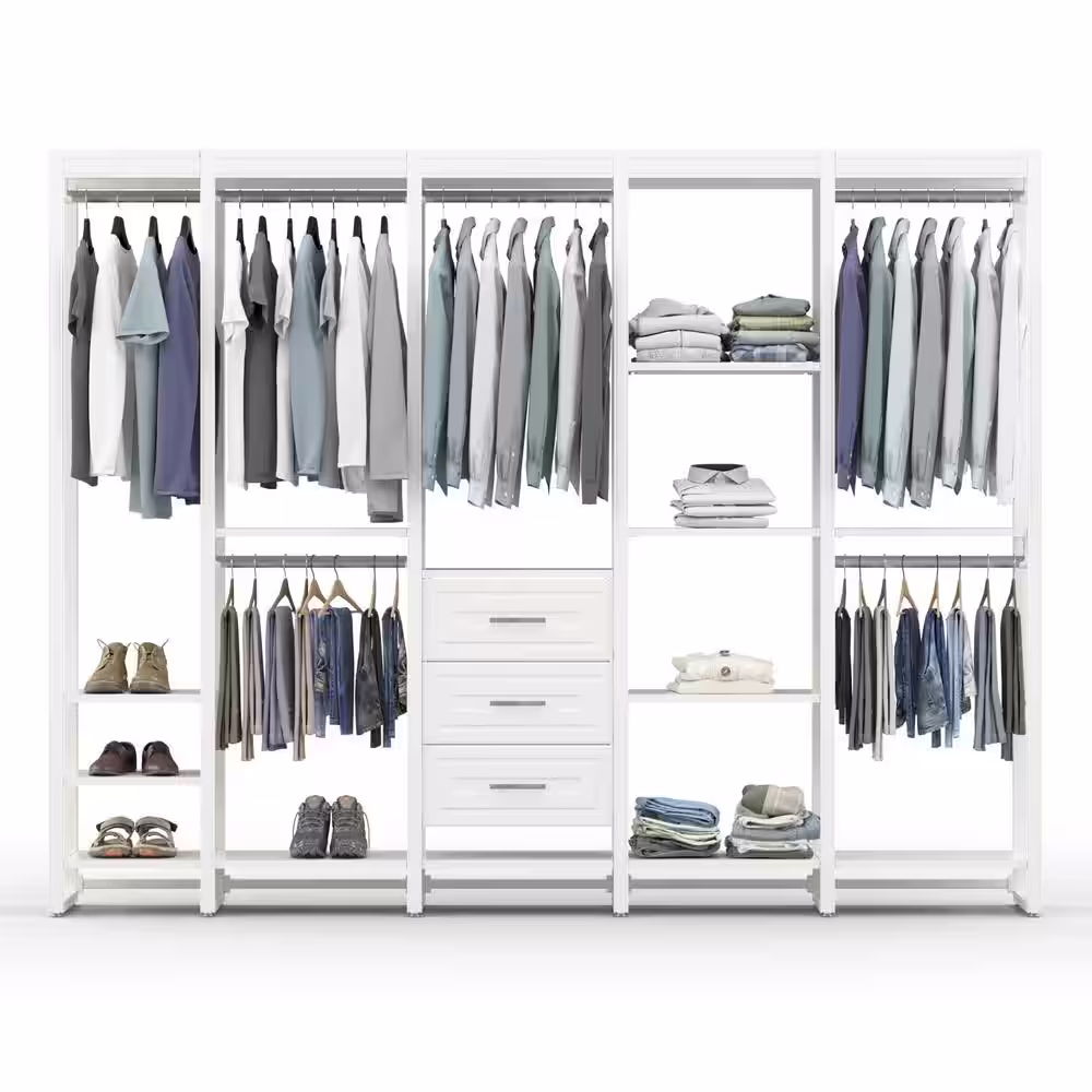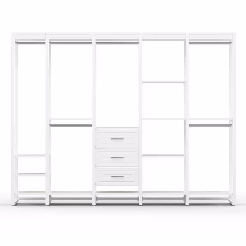 CLOSETS By LIBERTY 108 in. W White Adjustable Wood Closet System with 13-Shelves, 6-Rods and 3-Drawers