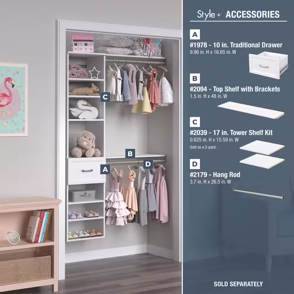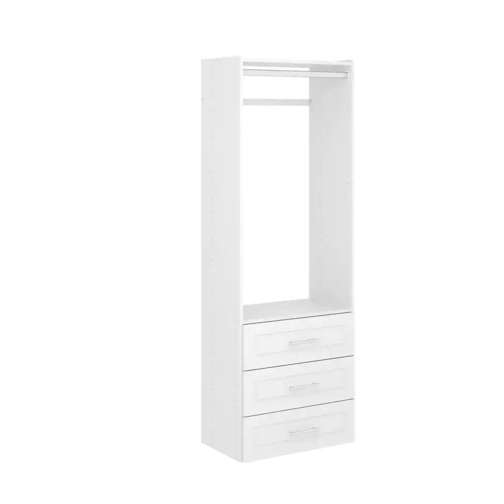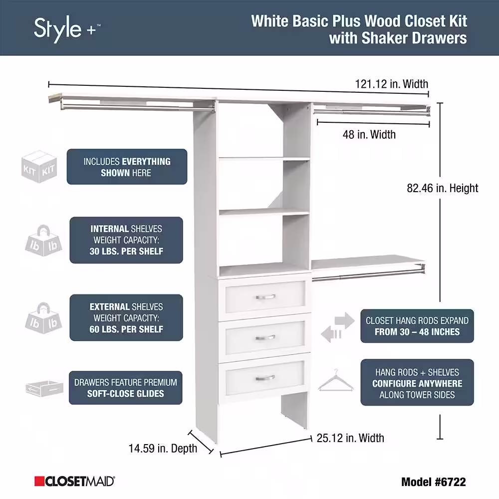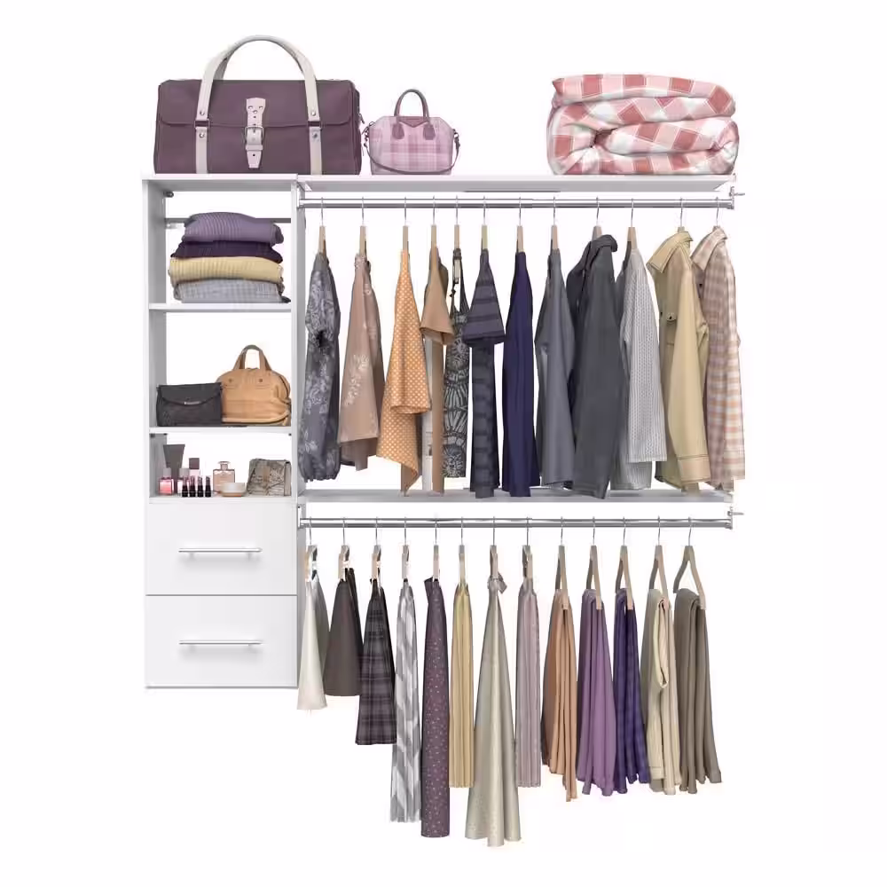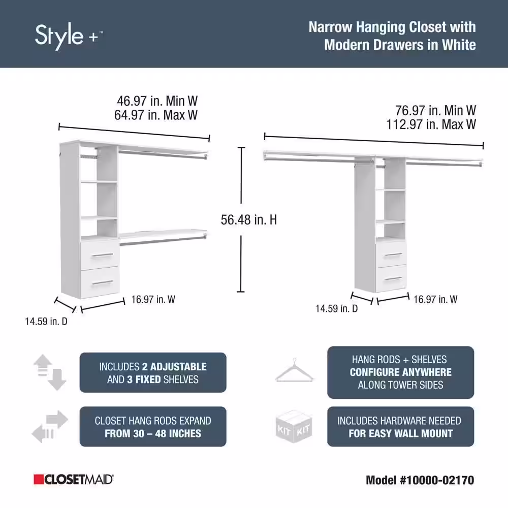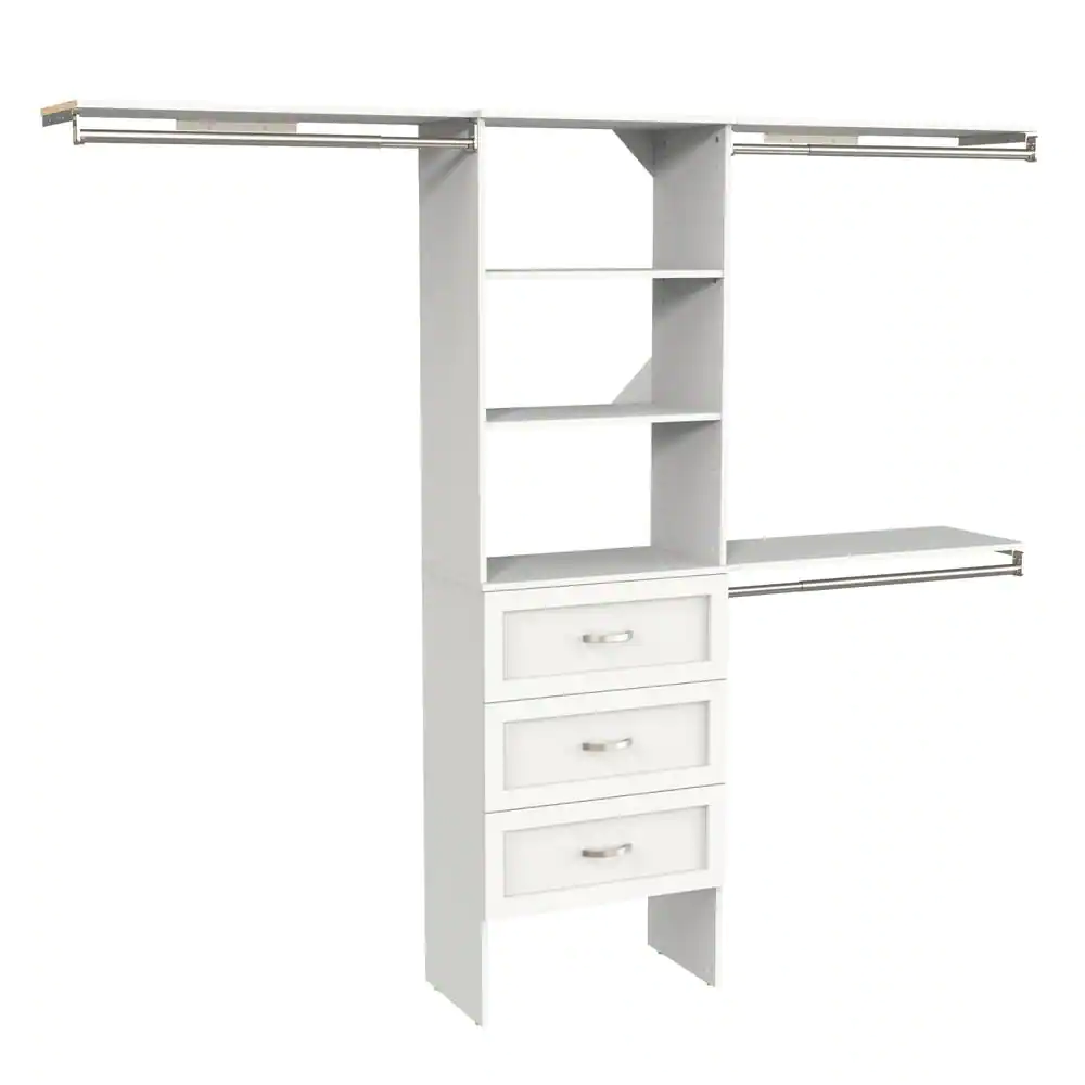 ClosetMaid Style+ 46.97 in. W - 112.97 in. W White Hanging Wood Closet System with Top Shelves and Modern Drawers