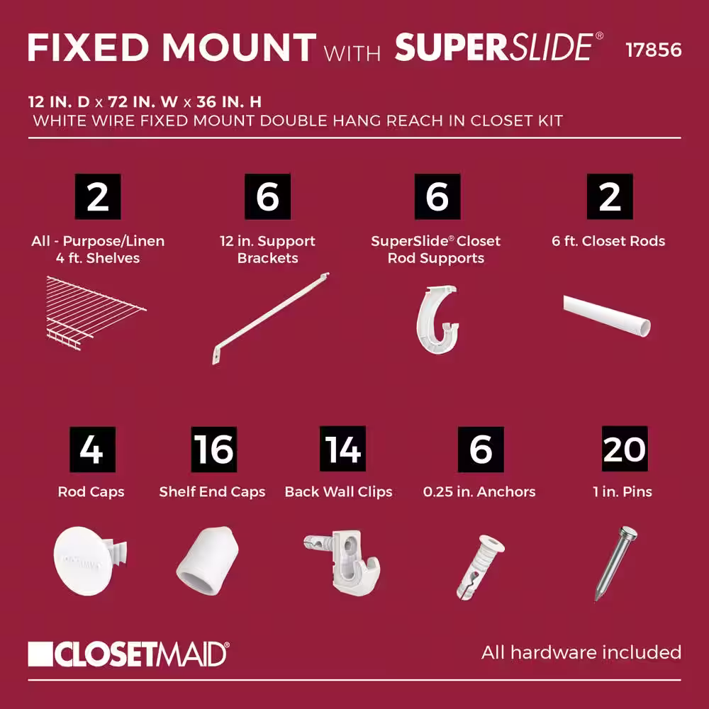 ClosetMaid Superslide 12 in. D x 72 in. W x 36 in. H White Wire Fixed Mount Double Hang Reach In Closet Kit