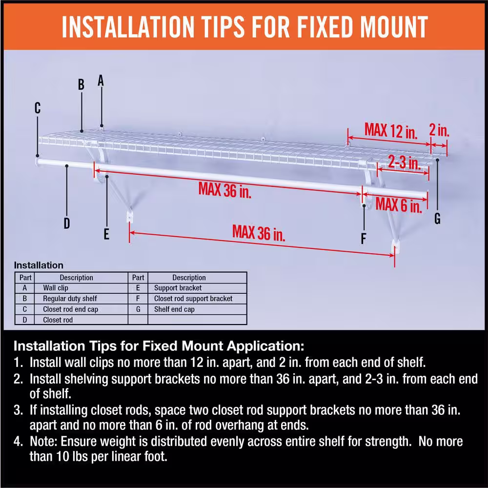 Everbilt 36 in. W to 36.82 in. W x 12 in. White Fixed Mount Shelf Kit Adjustable Wire Closet System