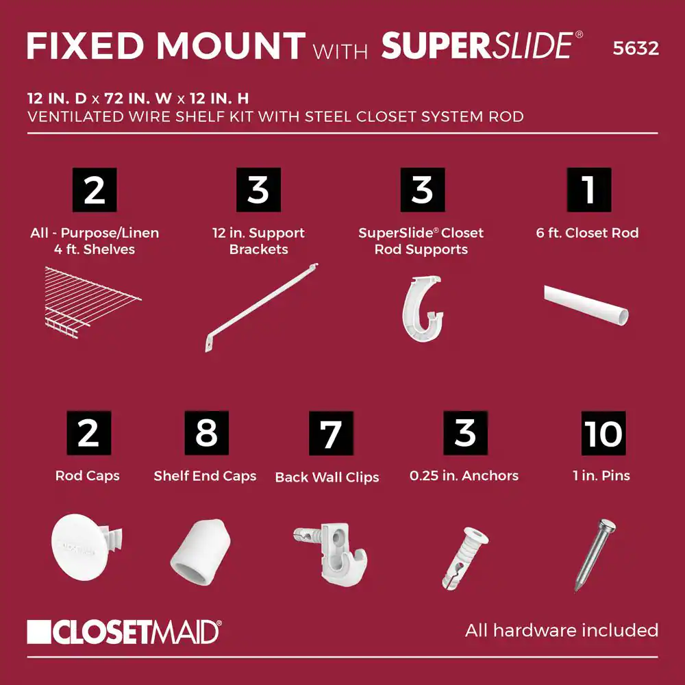 ClosetMaid SuperSlide 72 in. W x 12 in. D White Steel Wire Closet Shelf Kit with Closet Rod