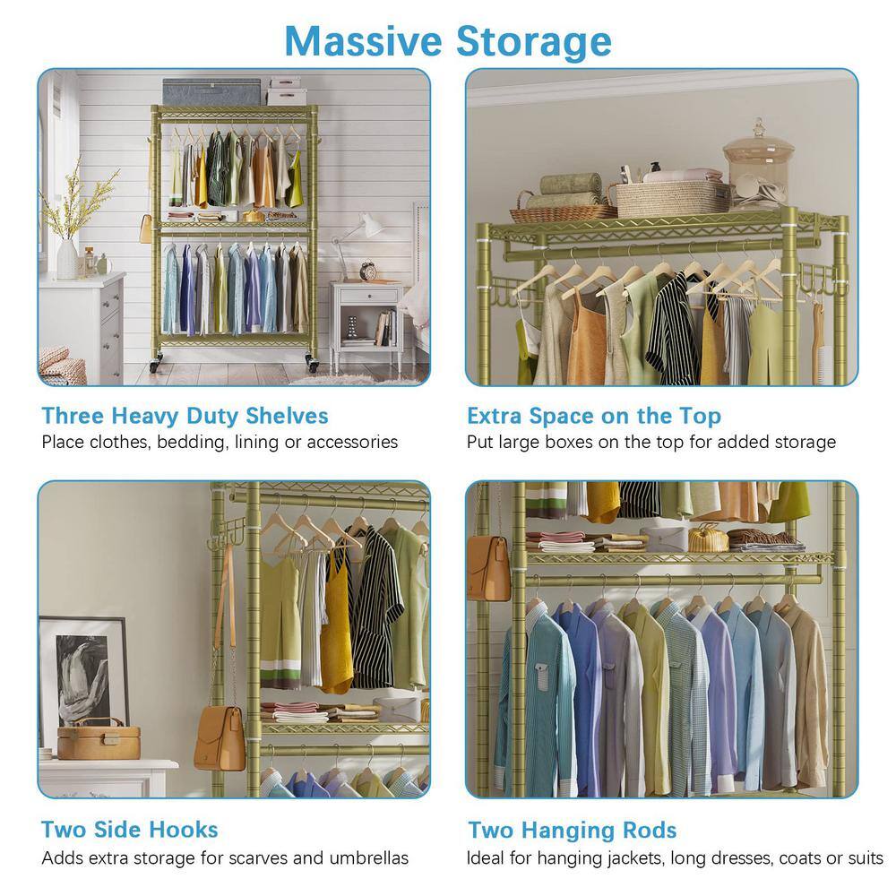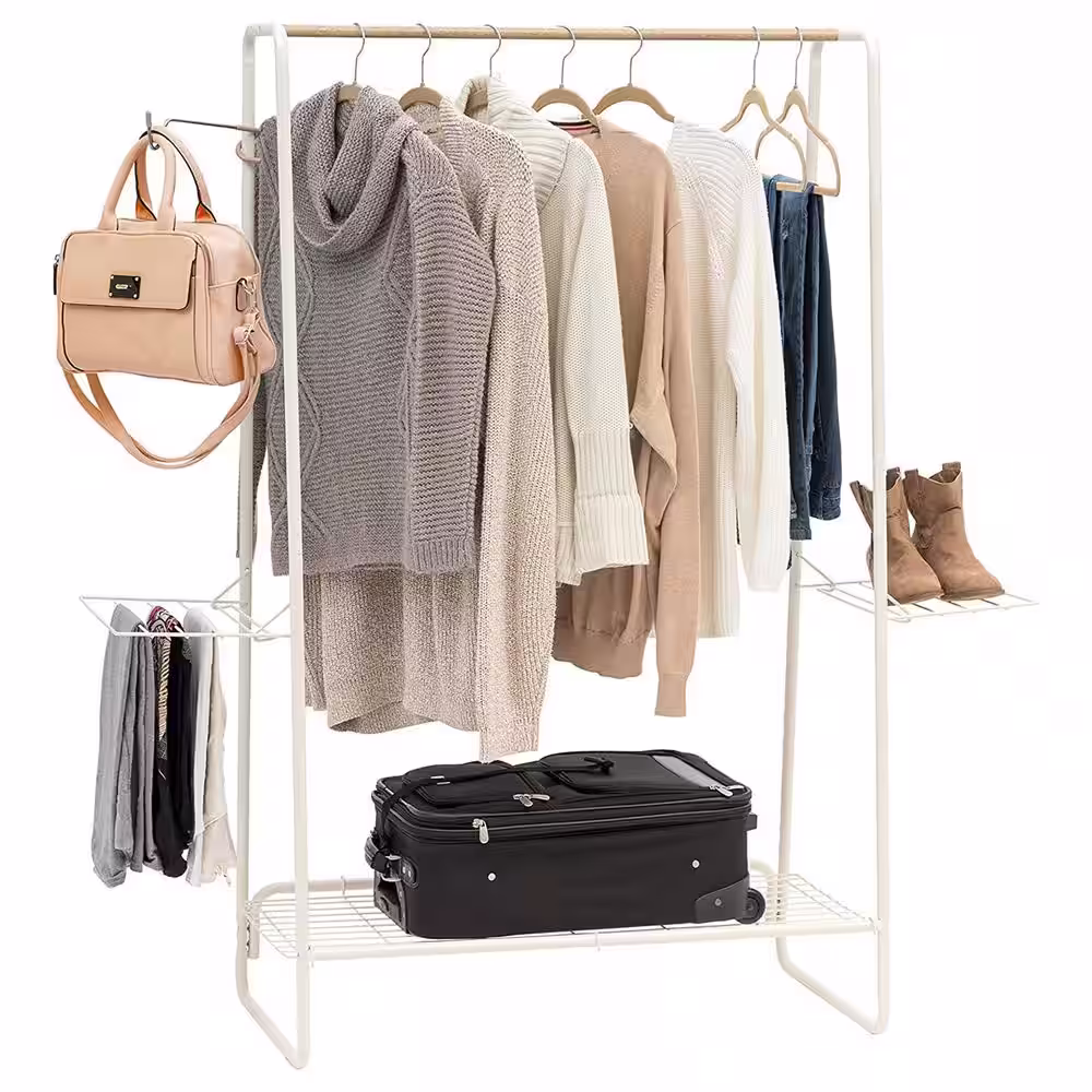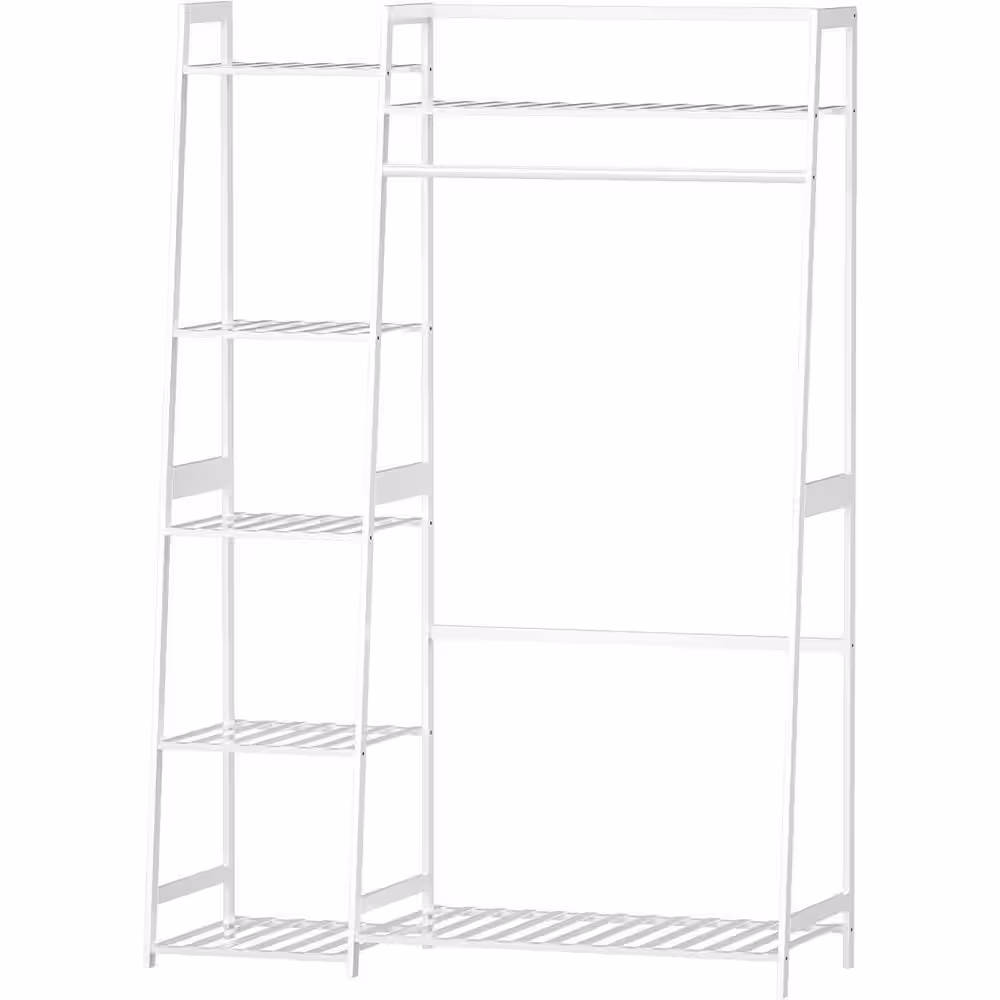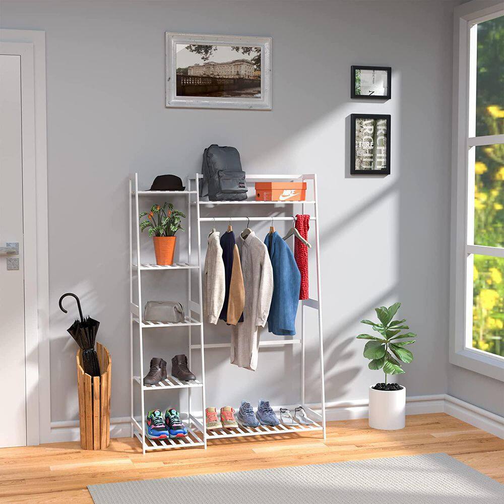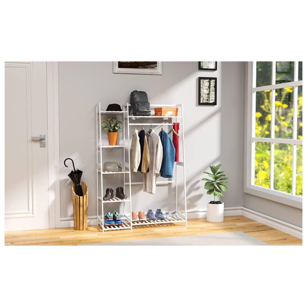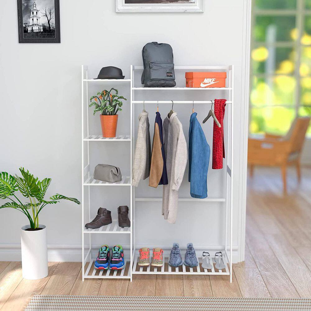 None White Bamboo Freestanding Closet Organizer Storage Shelves Hanging Heavy Duty Clothes Rack with Shelves