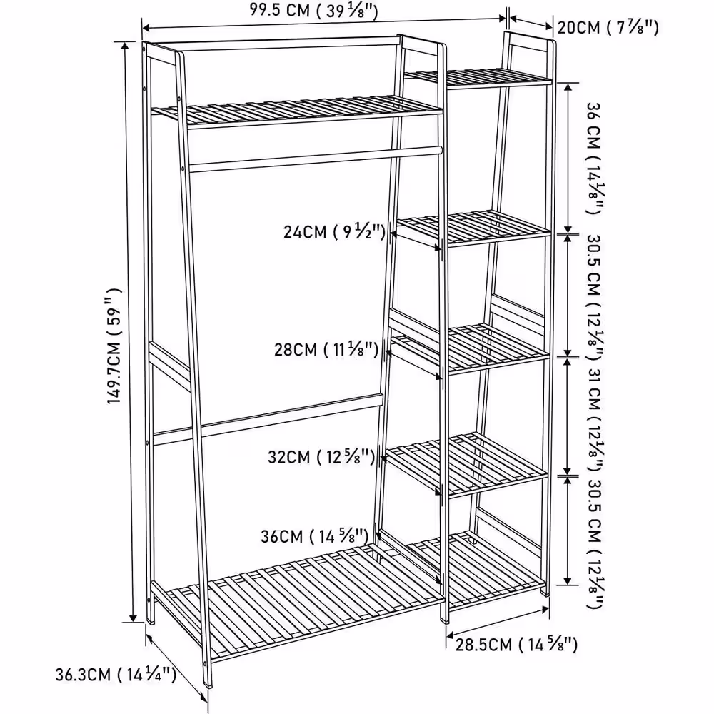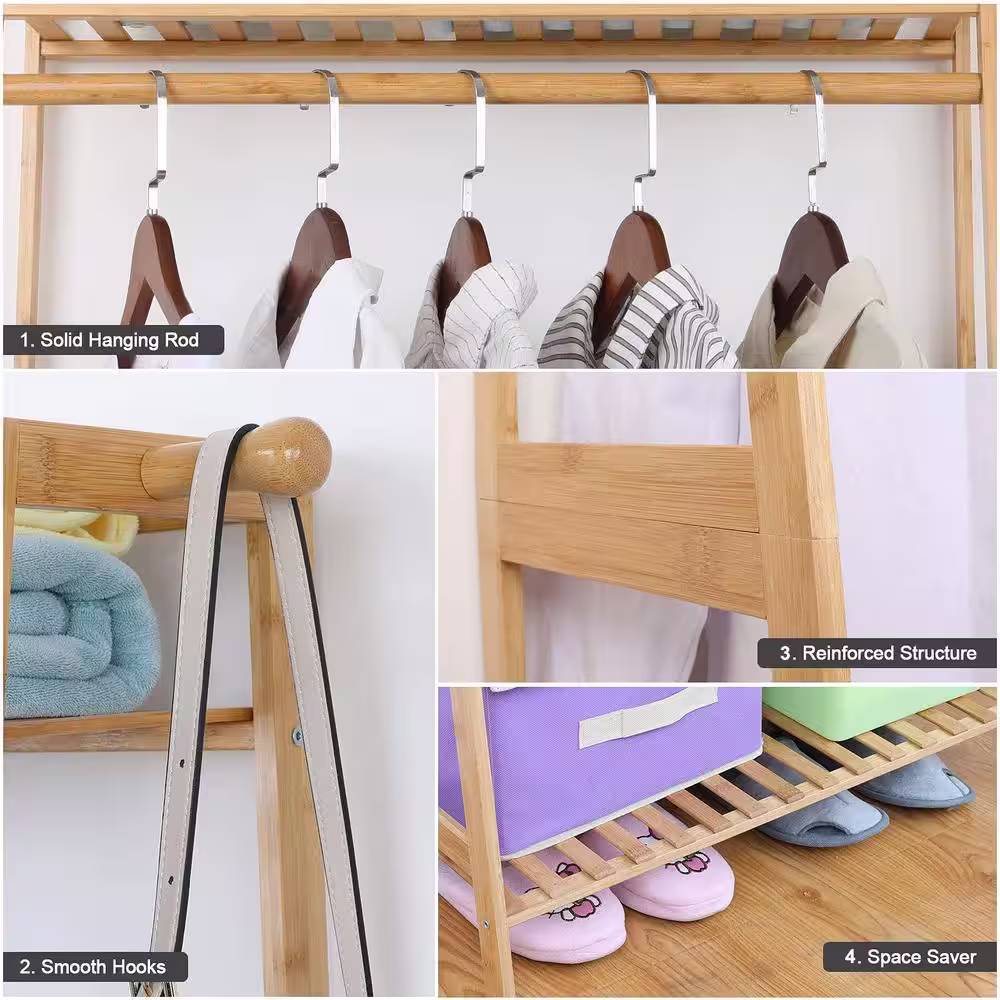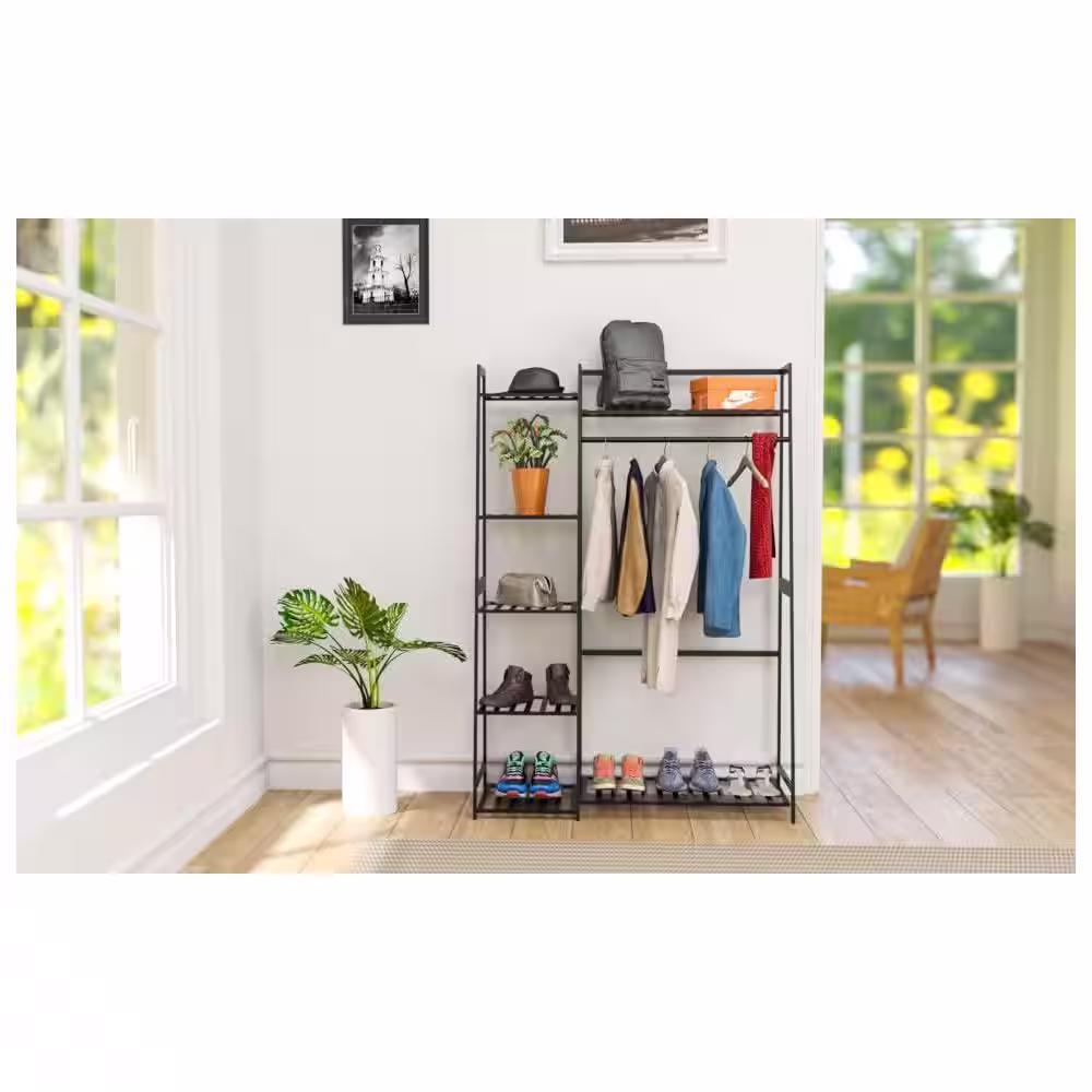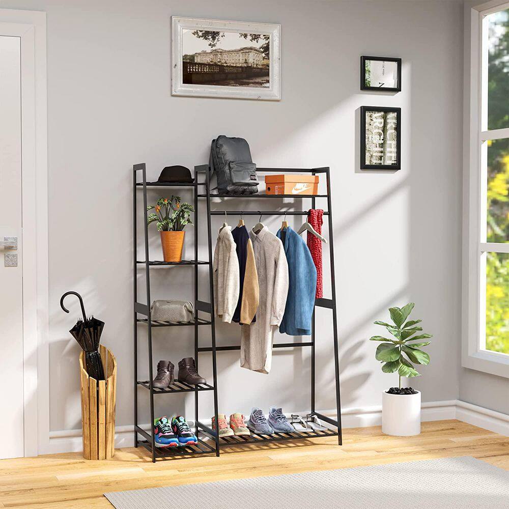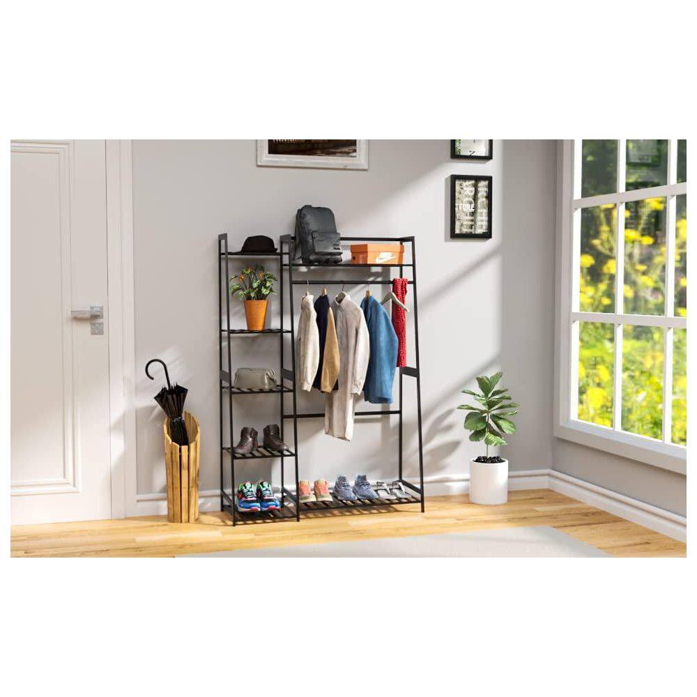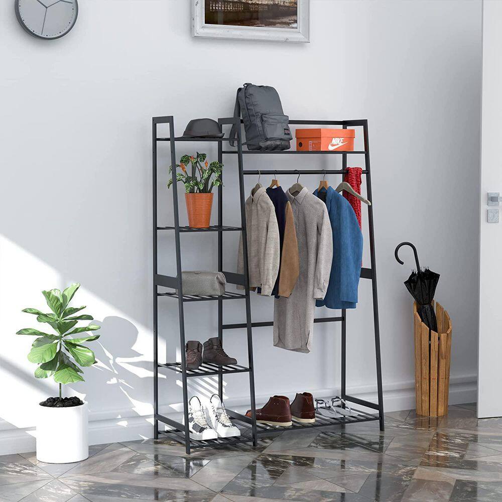 Siavonce Black Bamboo Freestanding Closet Organizer Storage Shelves Hanging Clothes Rack with Shelves