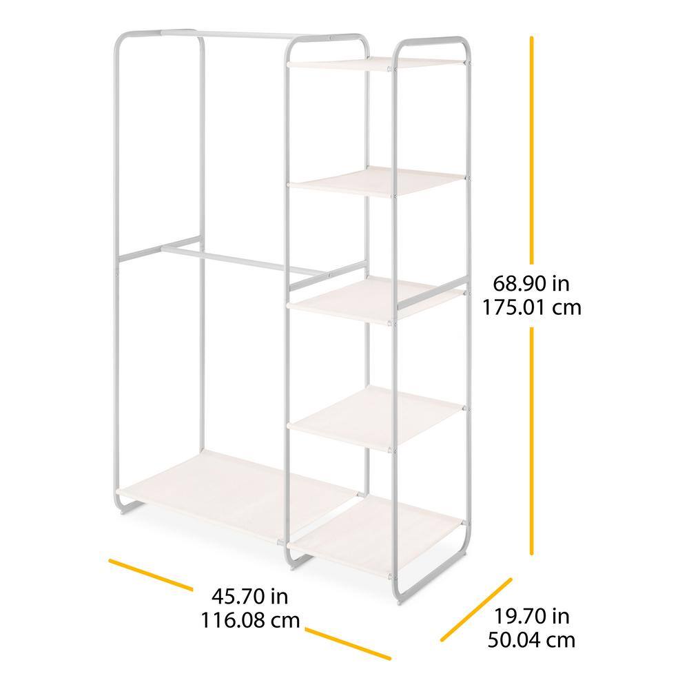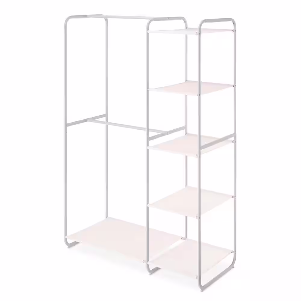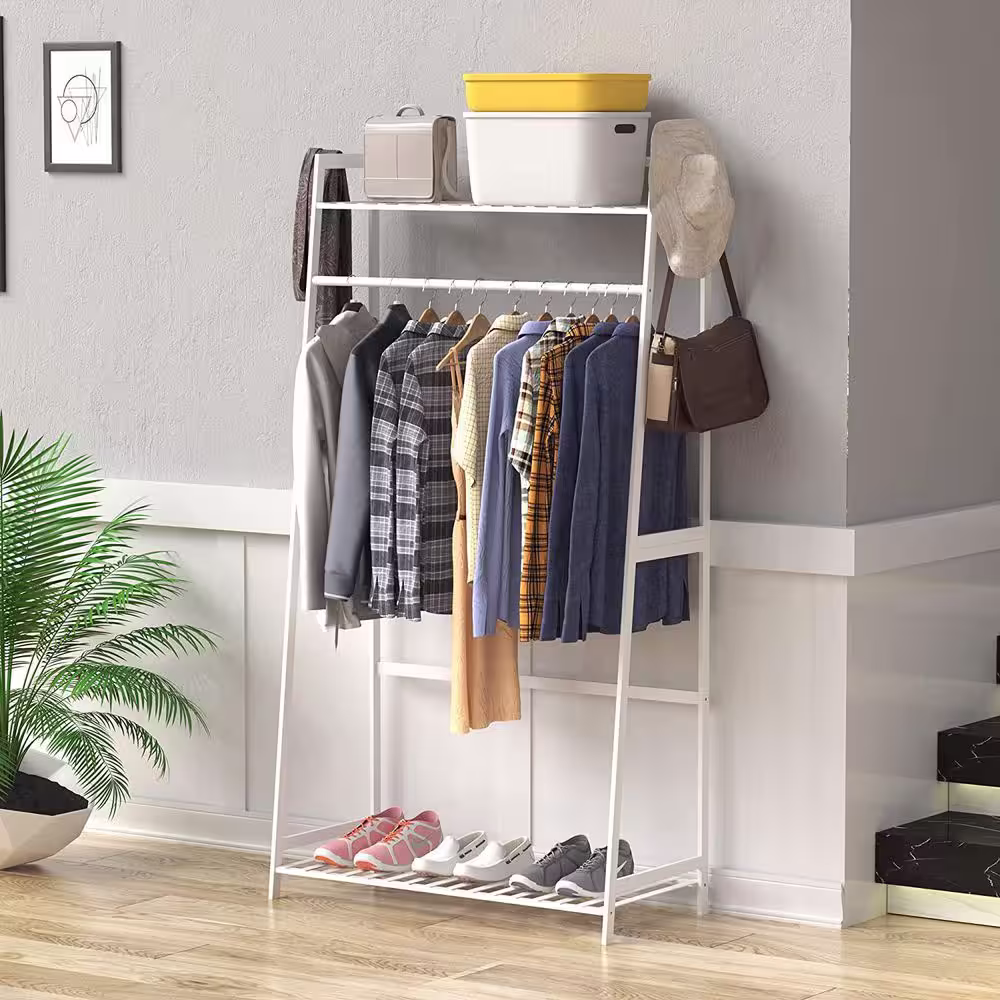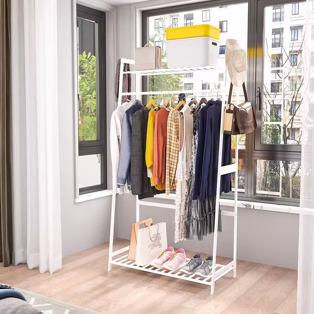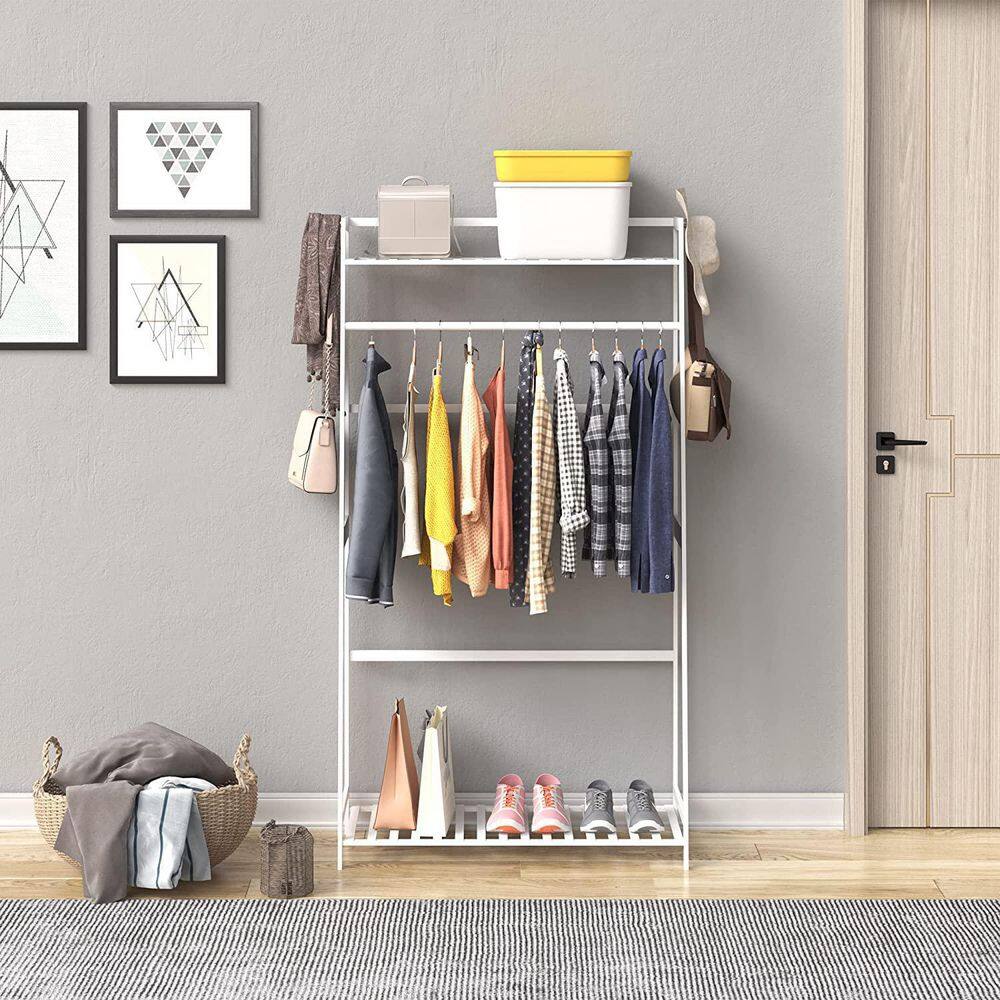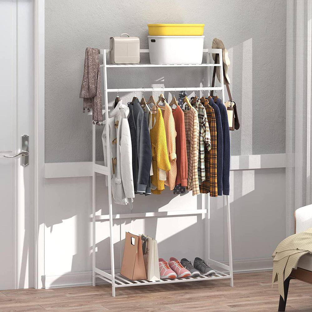 None Bamboo Freestanding Closet Organizer Storage Shelves Hanging Clothes Rack with Shelves White
