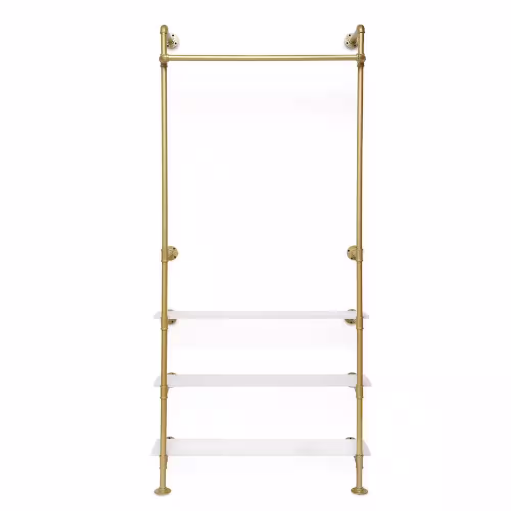 None Gold Wall Mounted Iron Clothes Rack with 3 Wood Shelves 36.6 in. W x 78.74 in. H