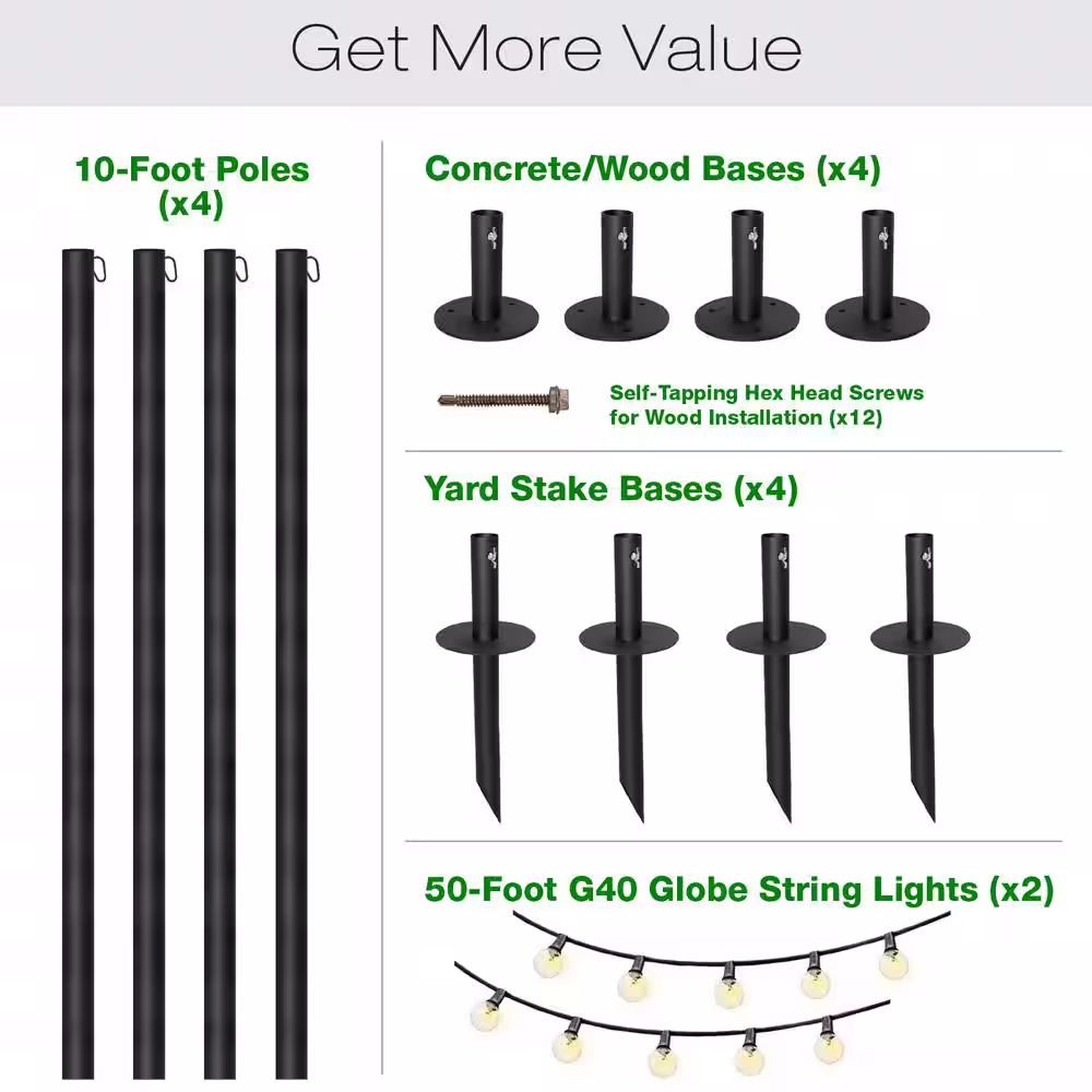 EXCELLO GLOBAL PRODUCTS Outdoor 100 ft. Plug-in Globe Bulb String Light with Four 10 ft. Mounting Poles