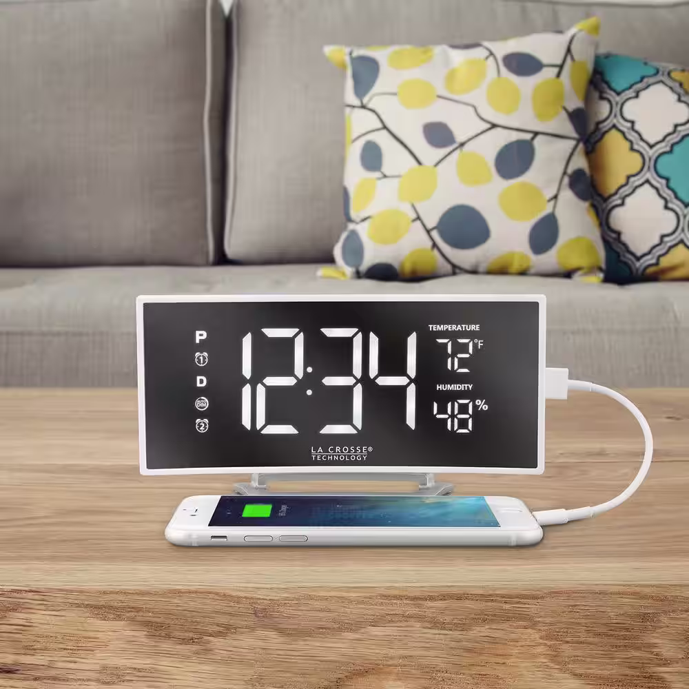 La Crosse Technology Curved Mirror LED Alarm Clock with Temperature & Humidity, USB Port