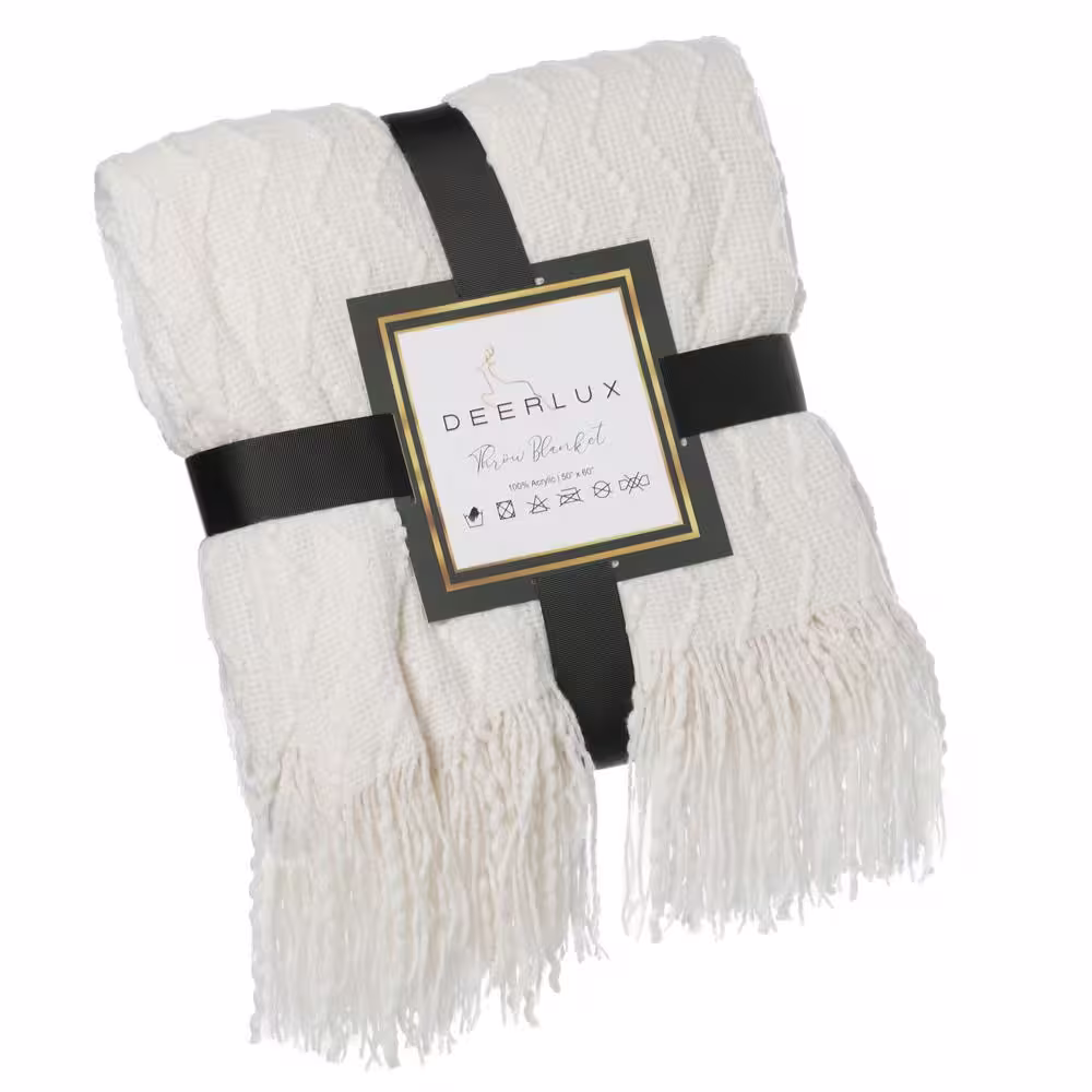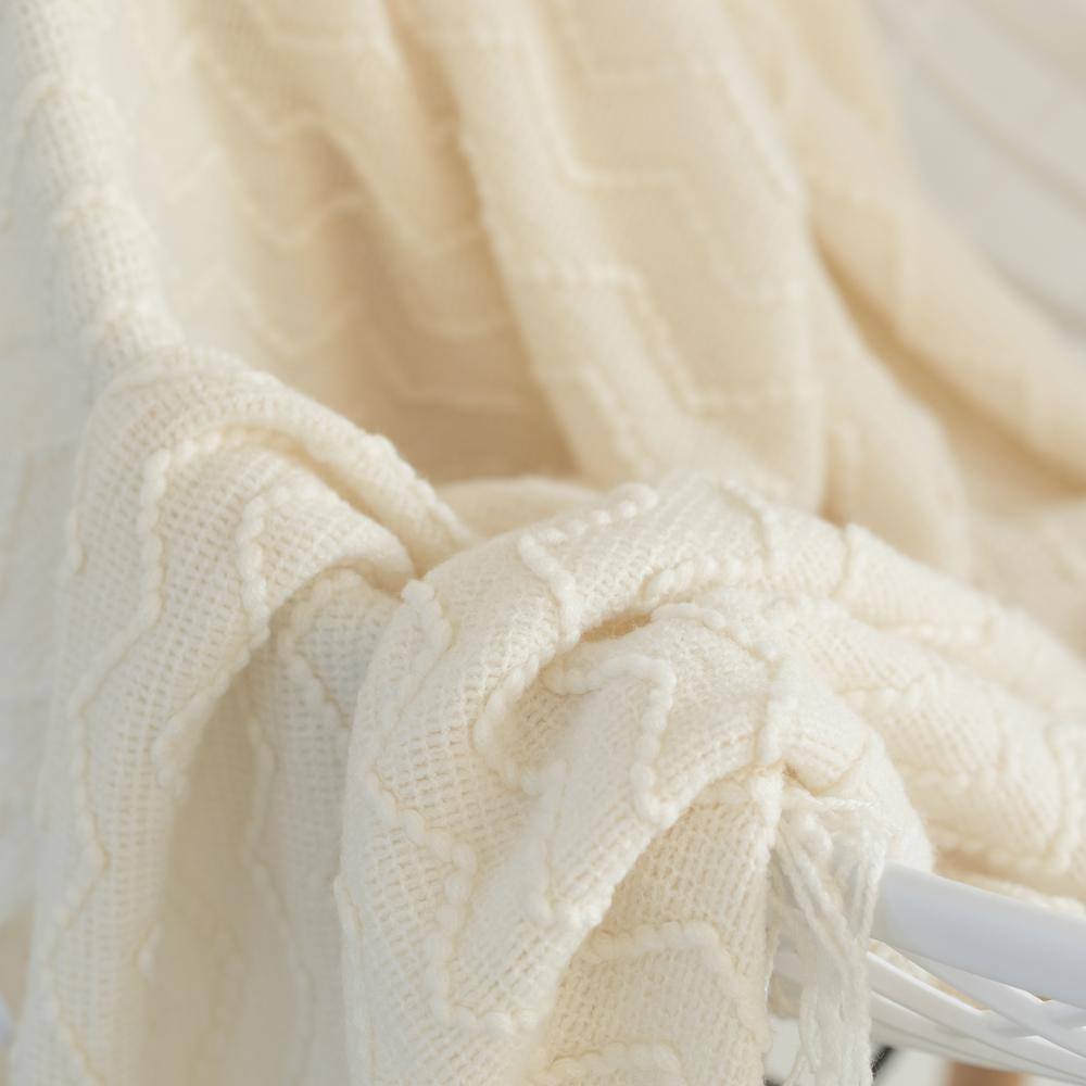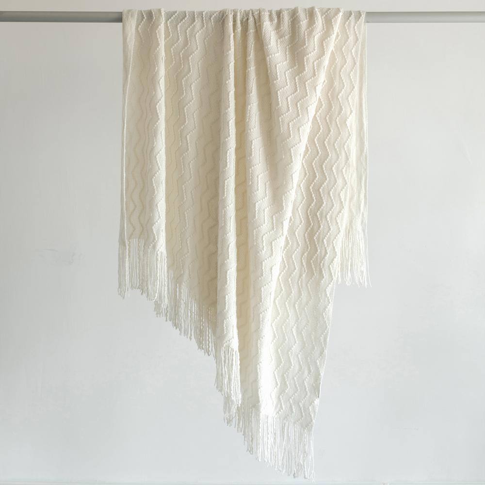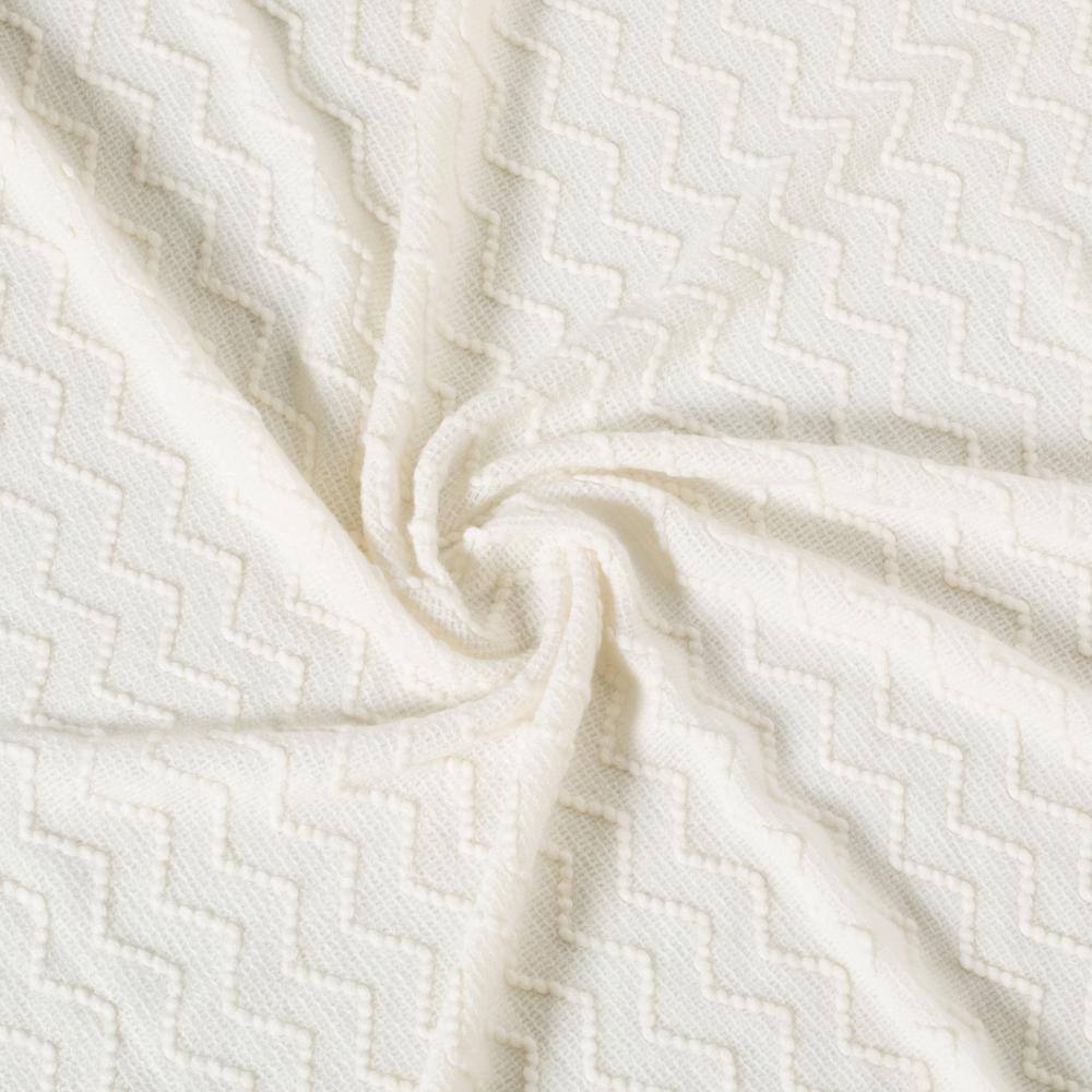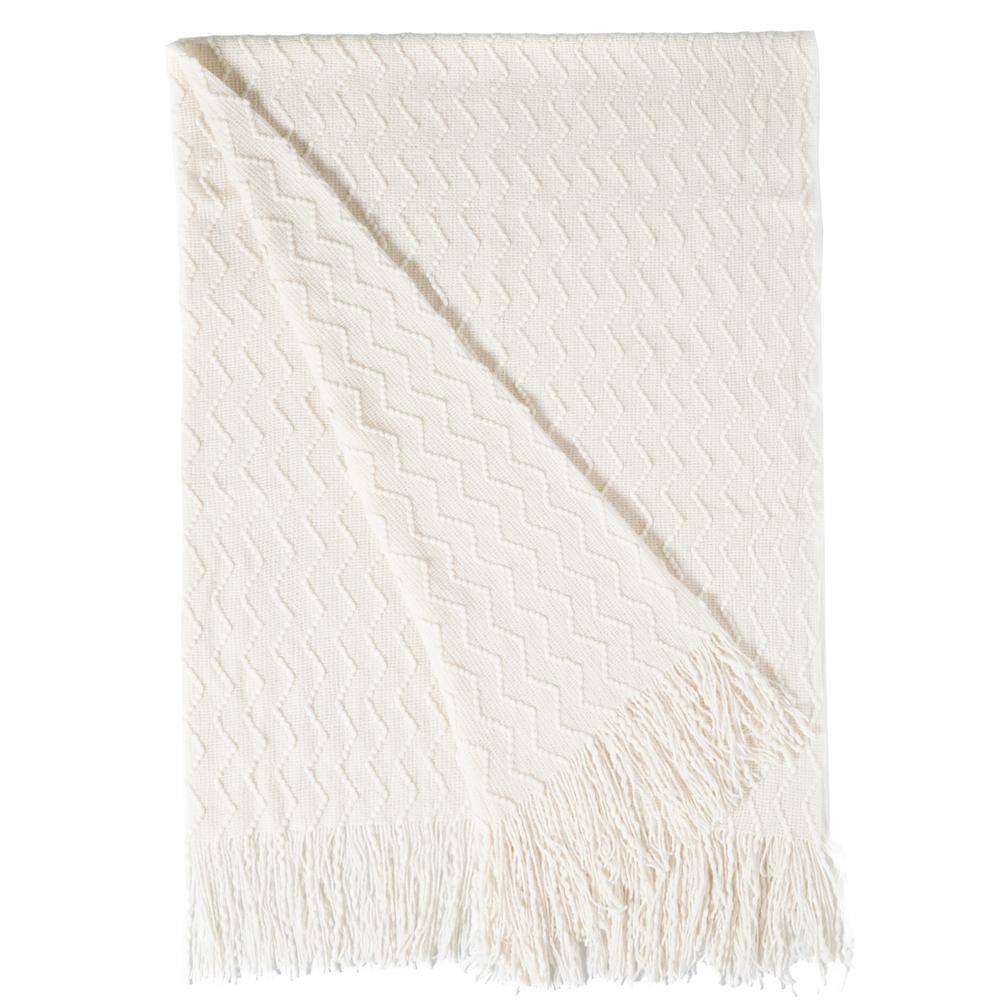 Quickway Imports White Decorative Chevron Pattern Knit Throw Blanket with Fringe