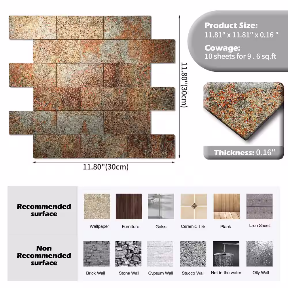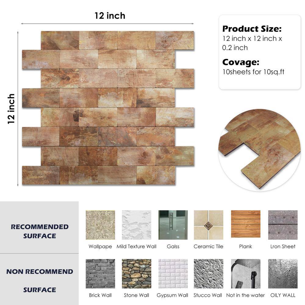 Yipscazo Subway Rusty Red 12 in. x 12 in. PVC Peel and Stick Tile (5 sq. ft./5-Sheets)