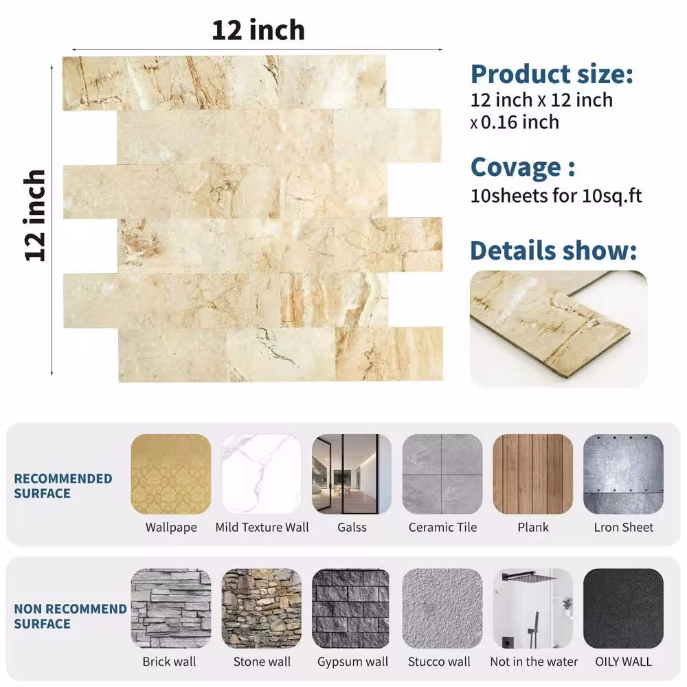 None Marble Collection Beige 12 in. x 12 in. PVC Peel and Stick Tile (5 sq. ft./5-Sheets)