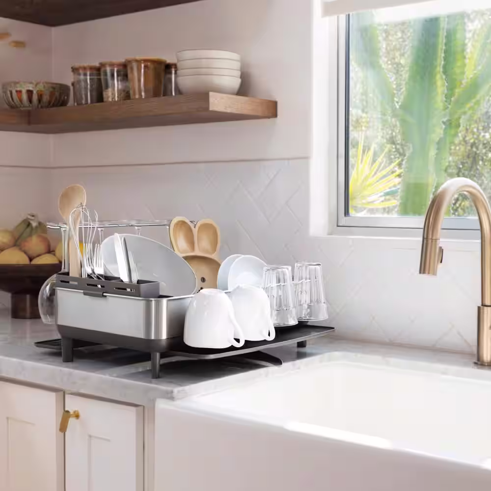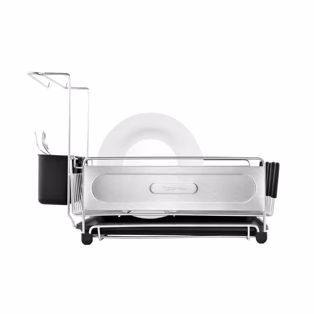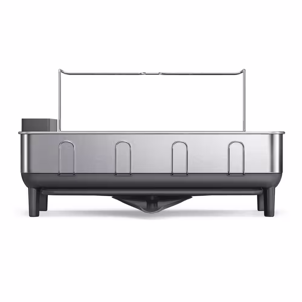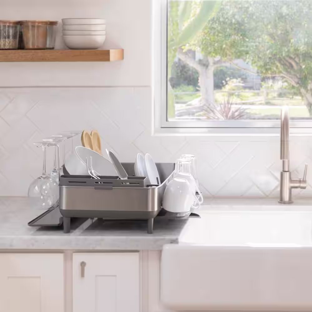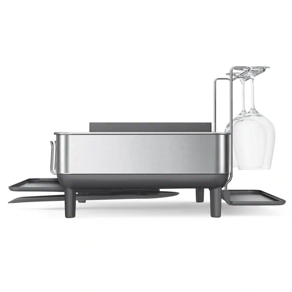 simplehuman Steel Frame Dish Rack with Wine Glass Holder in Fingerprint-Proof Stainless Steel and Grey Plastic