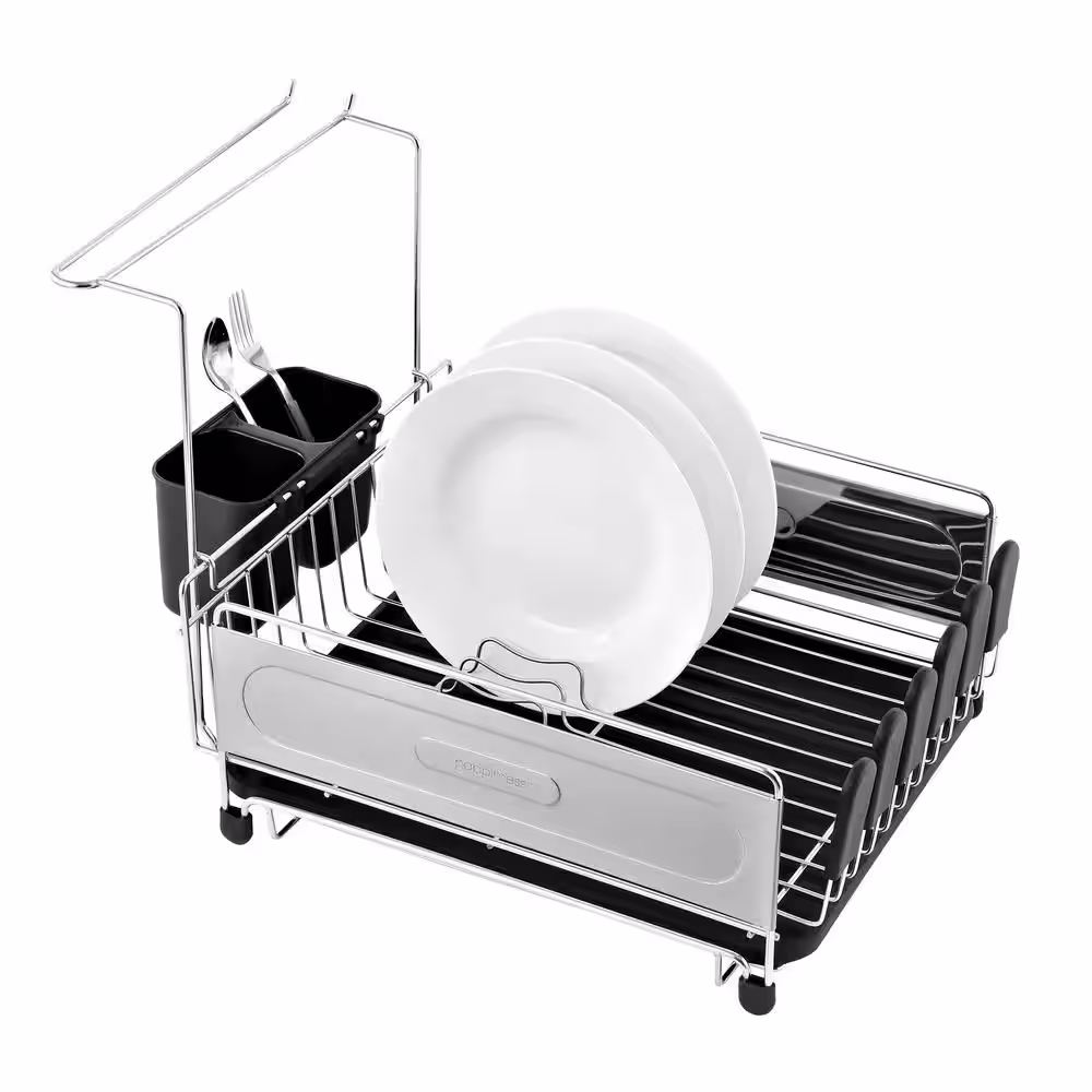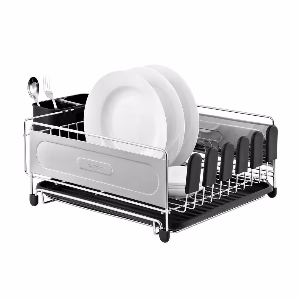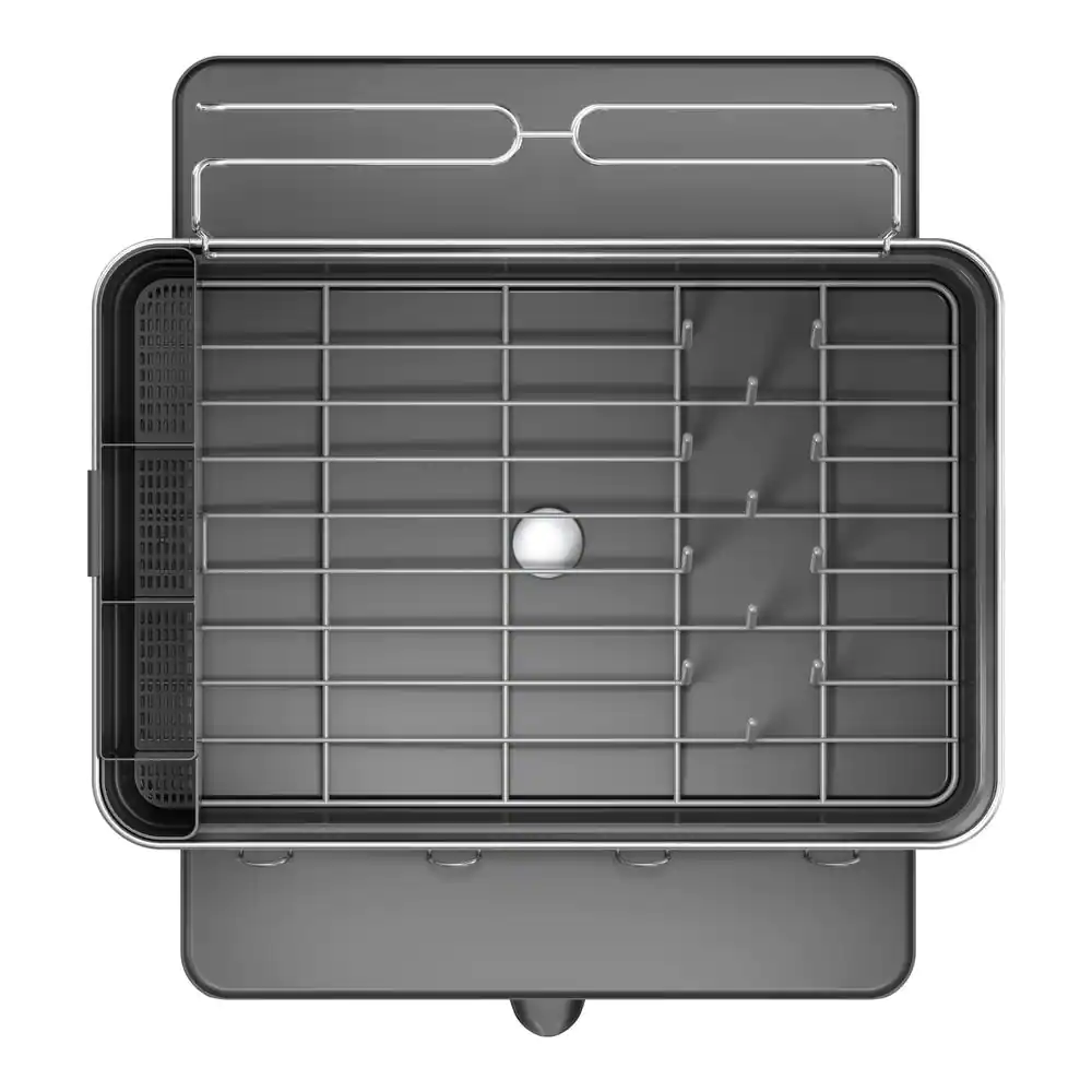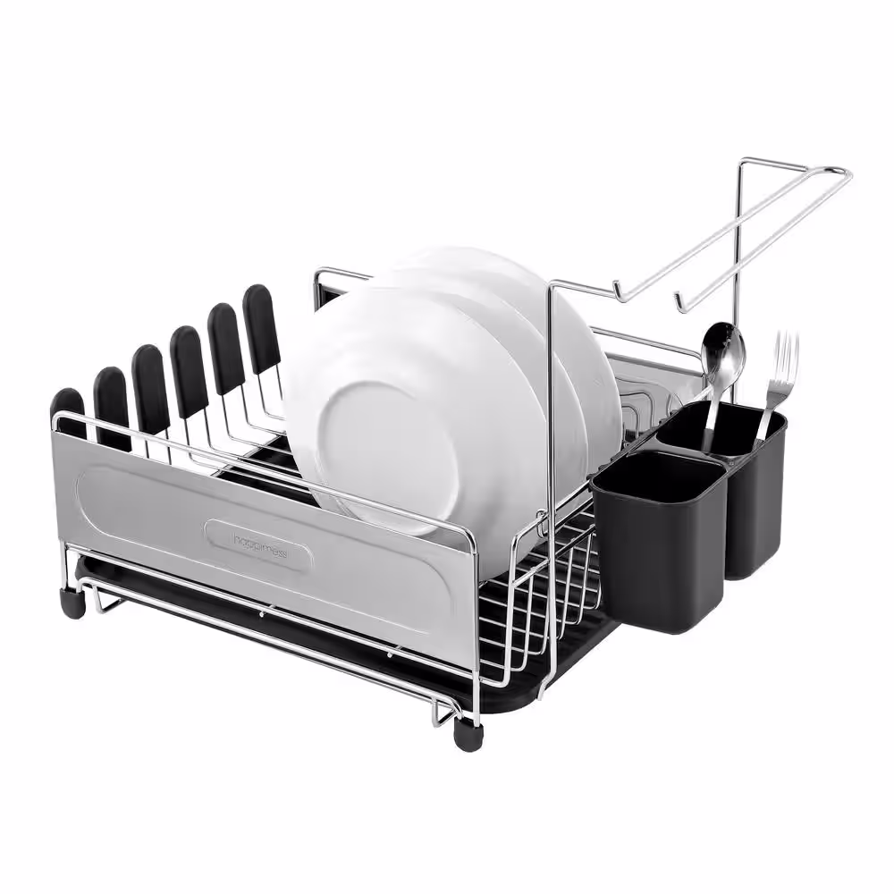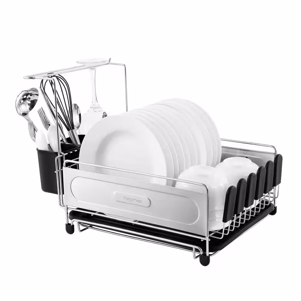 simplehuman Steel Frame Dish Rack with Wine Glass Holder in Fingerprint-Proof Stainless Steel and Grey Plastic