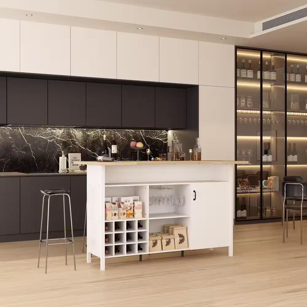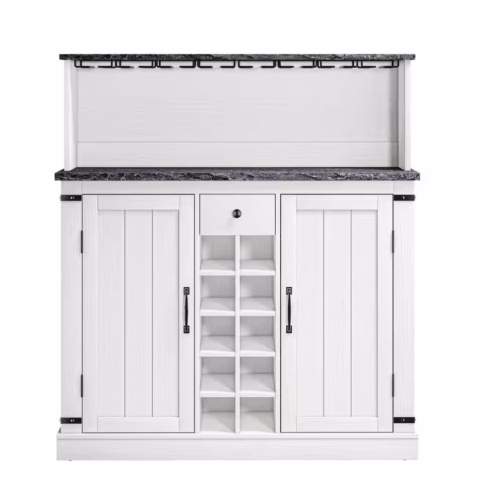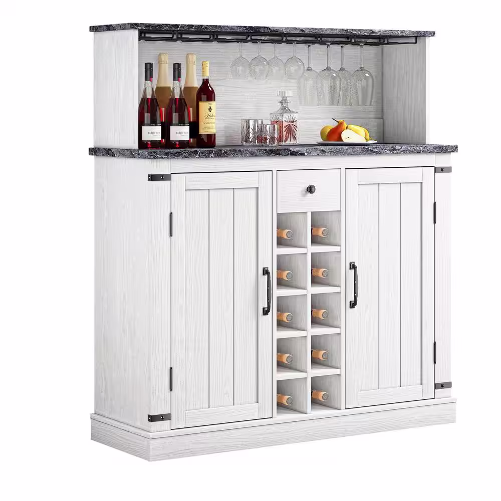 None 47 in. Cut-Off White Wood Buffet Bar Cabinet with Wine Rack with Granite Pattern Countertop